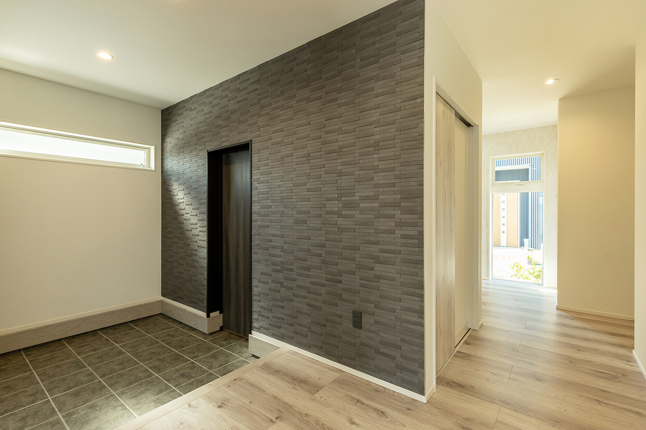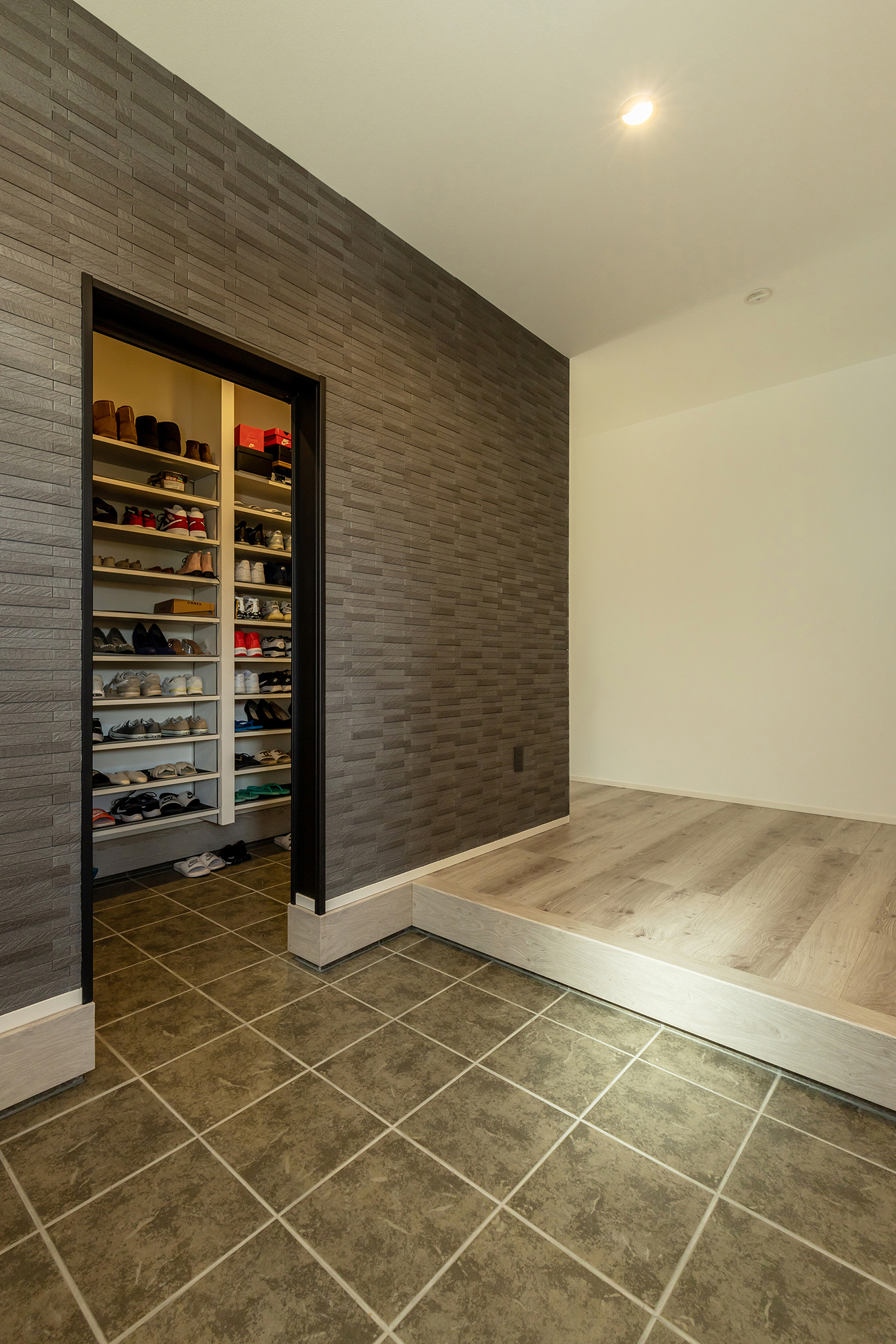 【玄関ホール】高級感のあるエコカラットの裏には、広めのシューズクロークを設けました。家族の靴を豊富に収納できるので、玄関は常にすっきりとします。