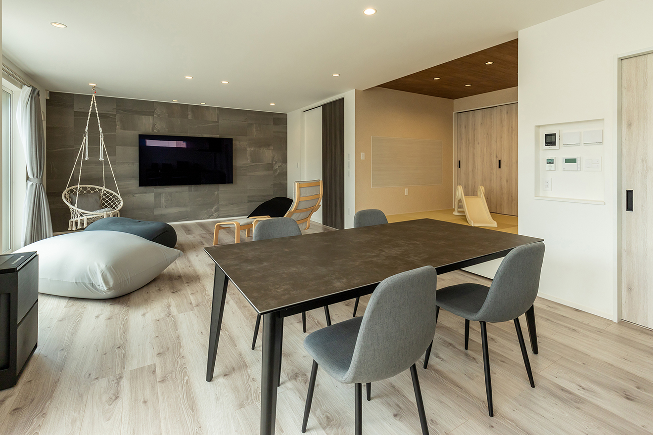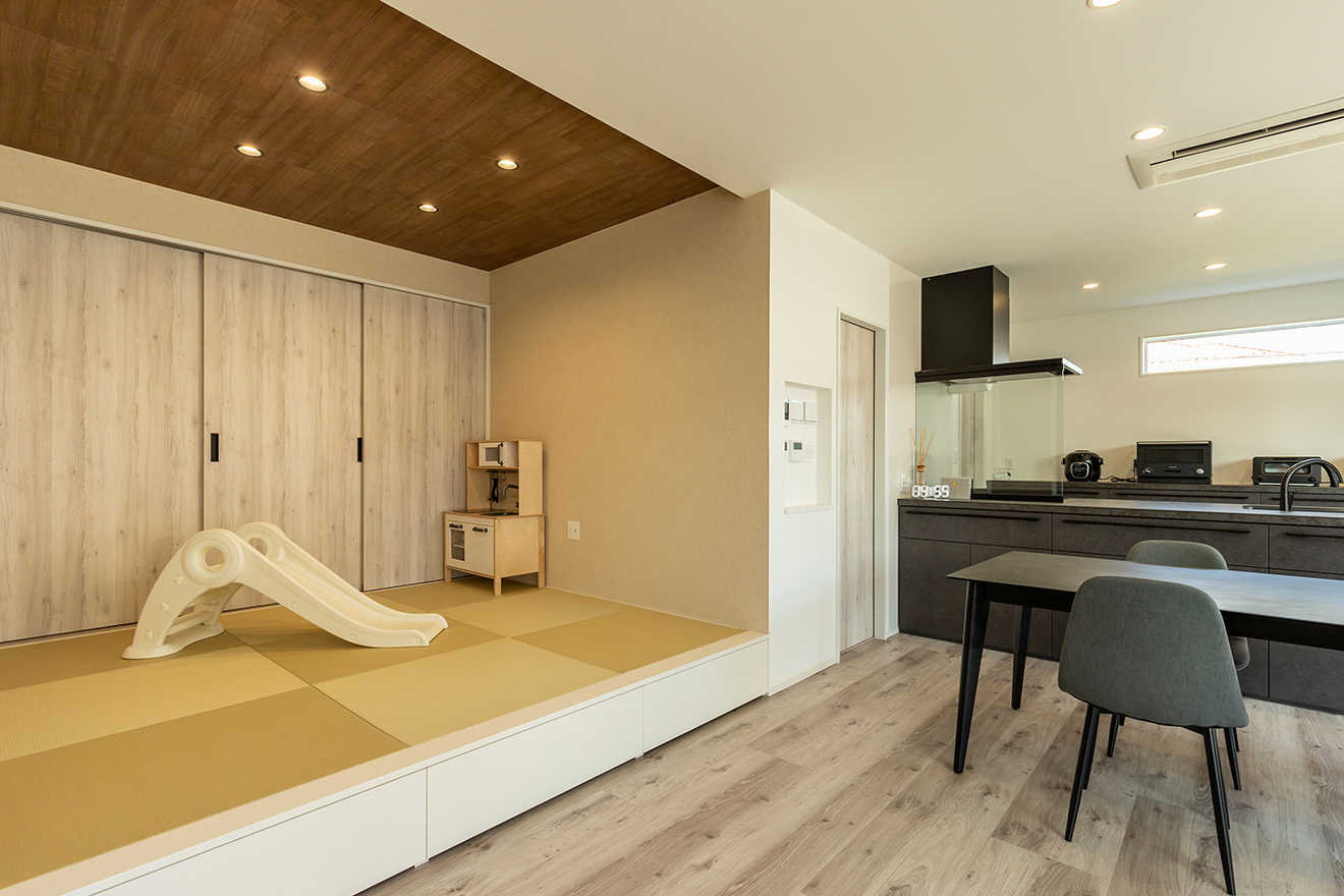 【和室】リビングと繋がるタタミコーナーは子供の遊び場としても使用できます。天井は羽目板仕様とすることで柔らかな空間となりました。 【キッチン】キッチンからリビング全体や中庭を見渡すことができるので、中庭でバーベキューなどを楽しむ際にも便利な配置です。