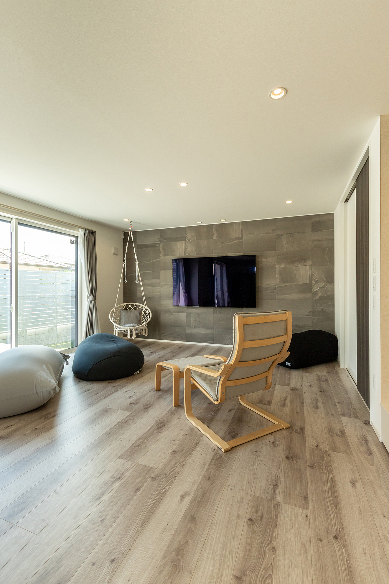 【LDK】壁掛けTV面にはアクセントとなるエコカラットを配置し、上質な空間を演出。掃き出し窓からはウッドデッキを望むことができ、より開放感を演出します。
