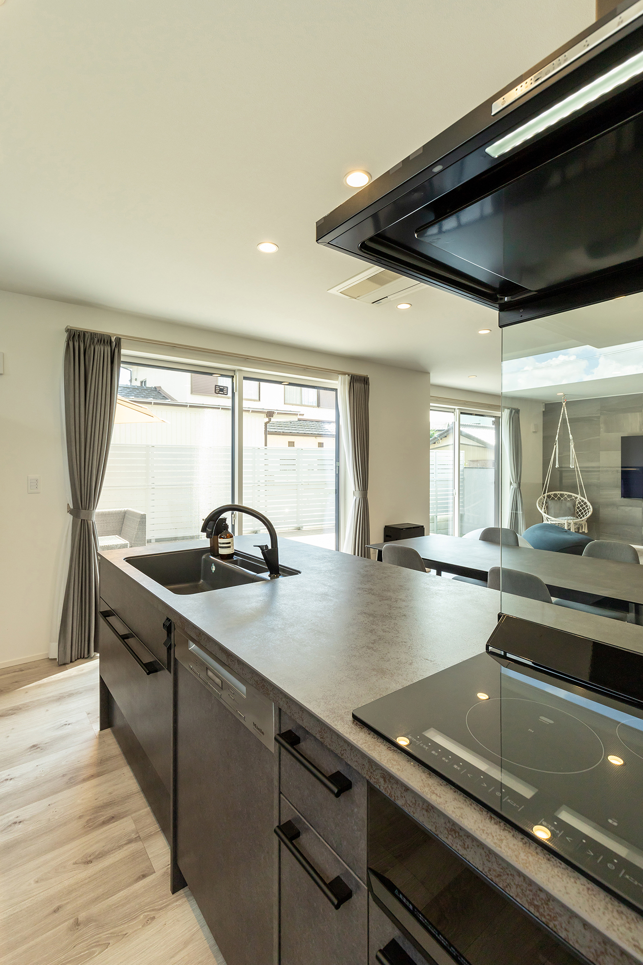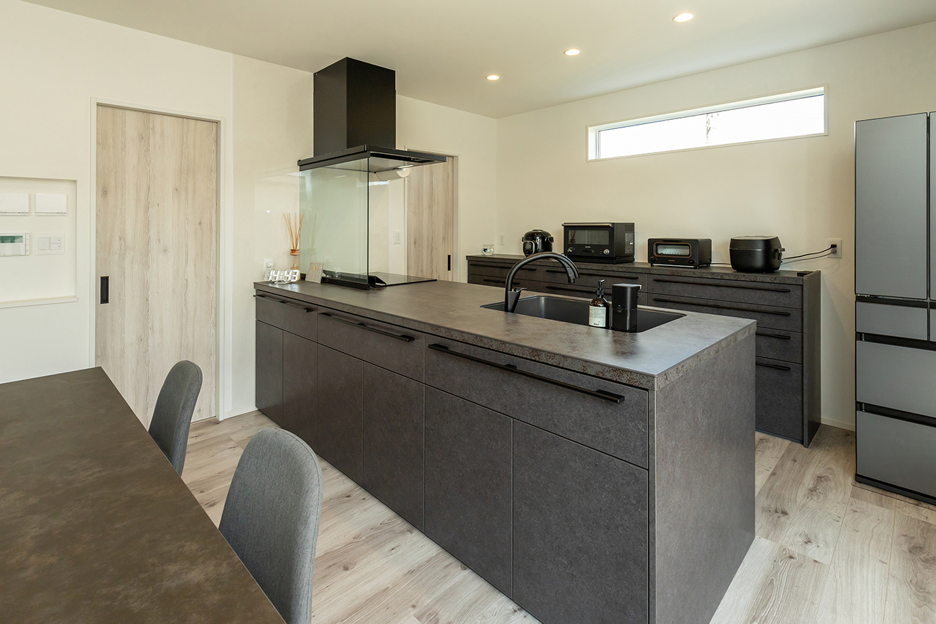 【キッチン】ブラックを基調としたキッチンは空間を引き締めます。パントリーや洗面と繋がっており、家事動線にも優れています。
