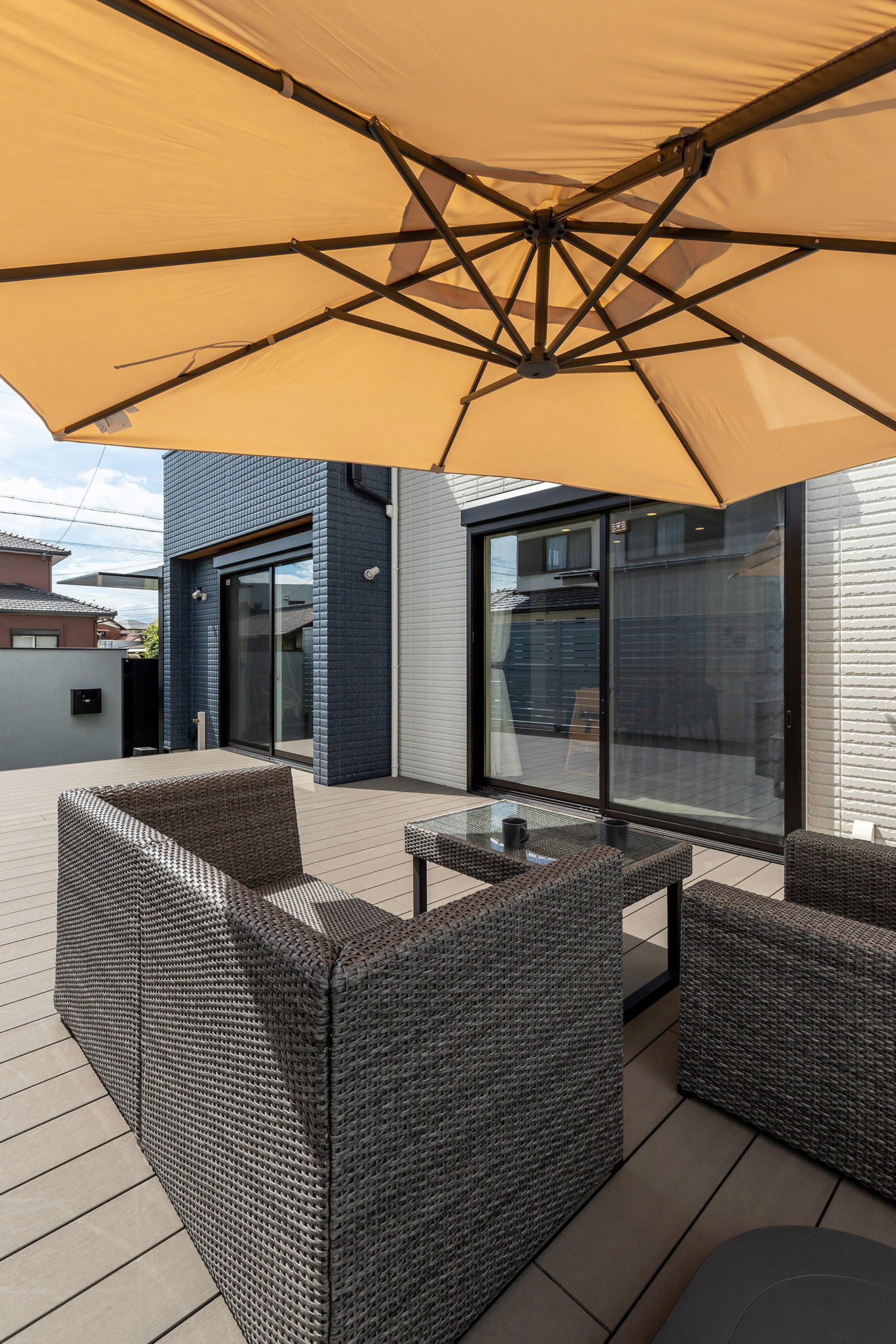 【ウッドデッキ】ハイフェンスで囲まれたプライベートに配慮した中庭。バーベキューや読書をしたりと趣味を楽しめます。
