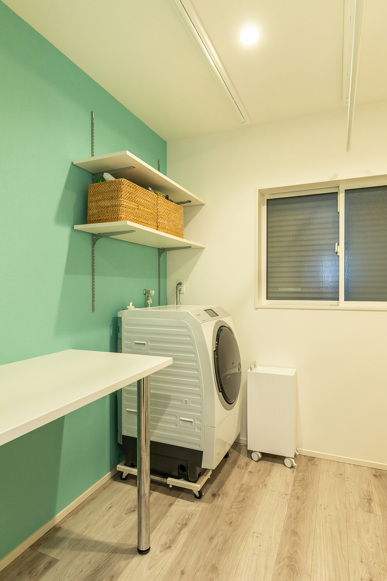 【ファミリークローゼット】物干し部屋と直接繋がっているので、乾いた服をすぐに収納できます。 【ランドリールーム】可動式の棚やカウンターを設けました。振り返ると物干し部屋があるため、移動も少なくて済みます。