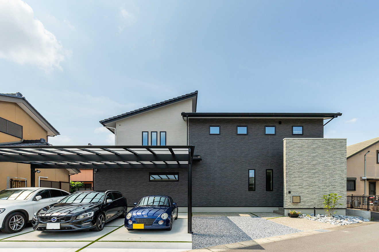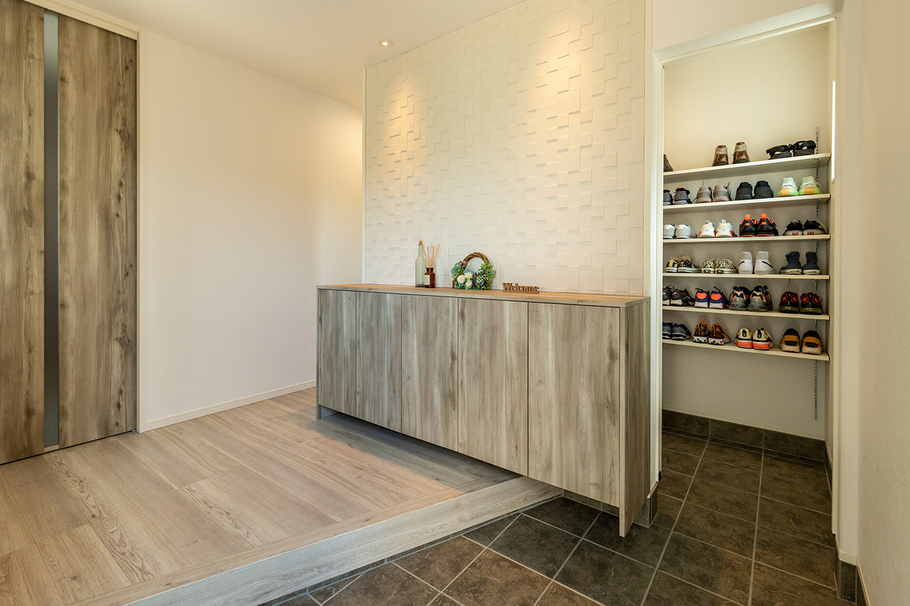 【外観】東西に広く重厚感がある外観。エントランスに壁を立てることによりアクセントウォールを表現しています。 【玄関ホール】スッキリとした玄関ホールにアクセントとなるエコカラットを入れました。ホワイトを基調にした色合いは優しい雰囲気を演出します。