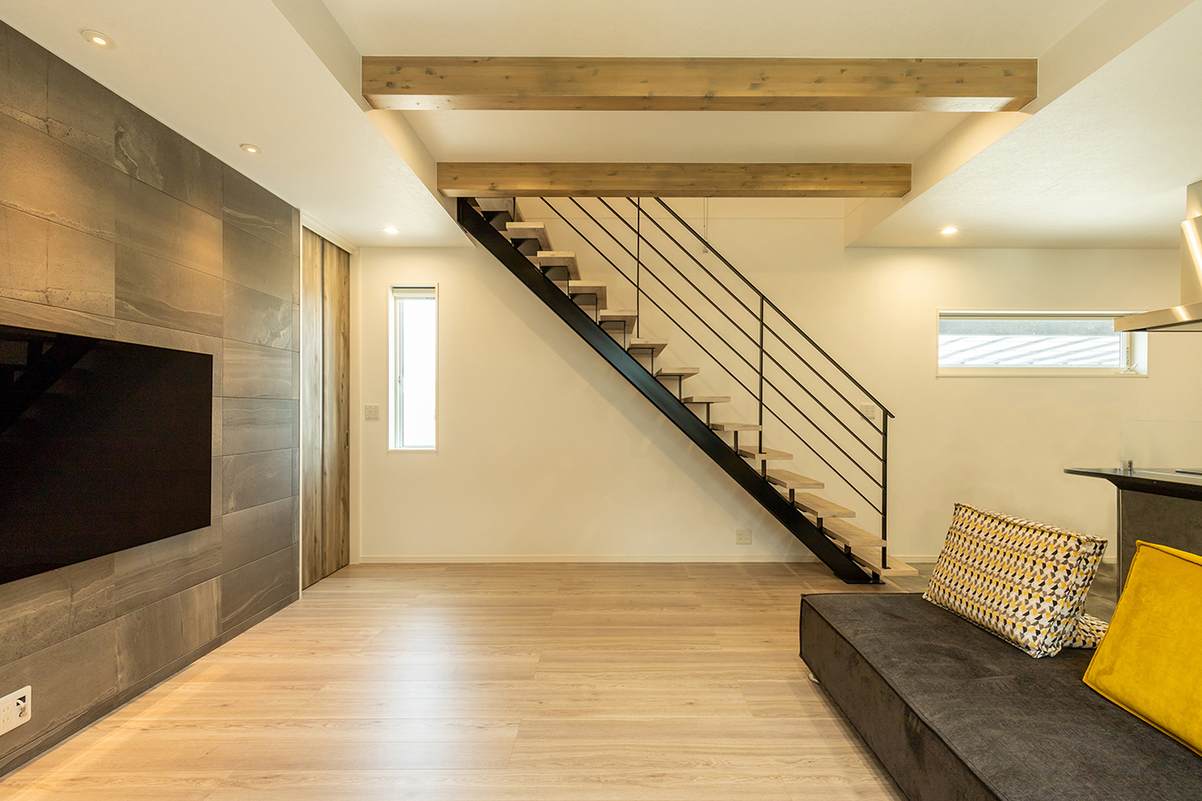 【LDK】今回の家のランドマークでもあるスチール階段。シンプルにデザイン良く構成された階段はリビングの空間をより印象的に表現します。