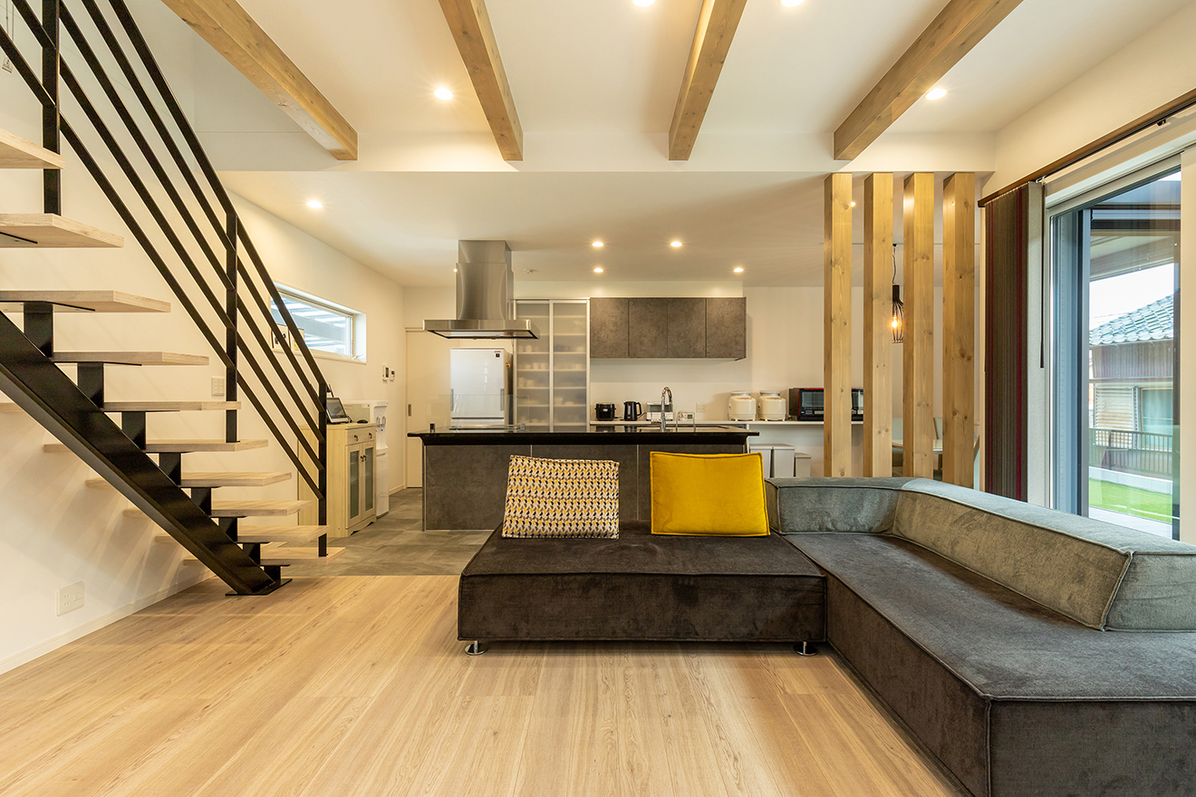 中庭を中心にLDK、和室と空間を繋げてすべてが見渡せるよう計画を行い、採光、通風を室内に沢山取り入れる開放感ある空間を実現。リビングの一部は化粧梁とし意匠的に美しいデザインのスチール階段を設けることにより空間の変化を演出しています。
