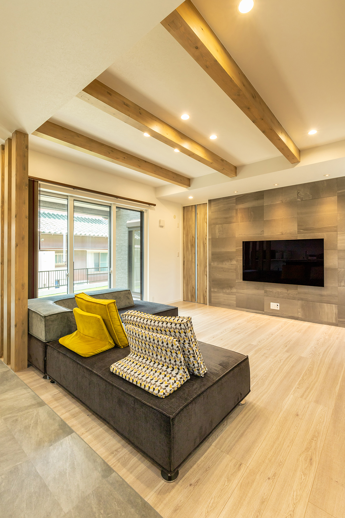 【LDK】奥様がご希望されたキッチンを中心にすべてが見渡せる設計。デザイン性のあるキッチンは部屋全体のアクセントとして引き立ちます。リビングは天井を高くし、化粧梁を設けることで見た目の変化と木目の優しい印象を与えます。また、壁面はアクセントでエコカラットを施工し、壁付けのTVが活きる工夫をしました。