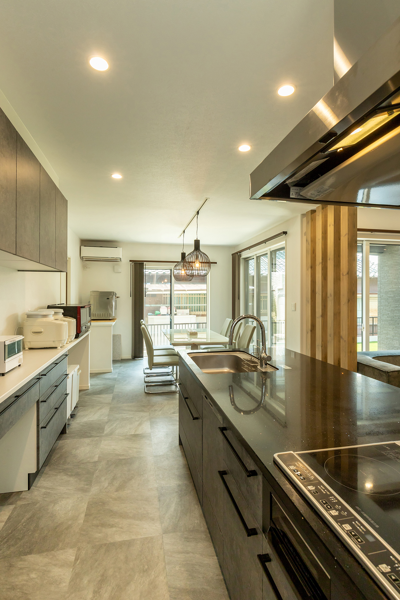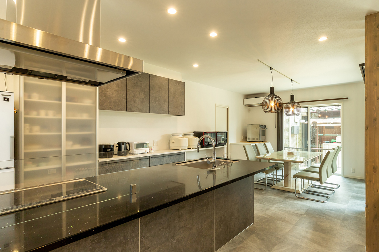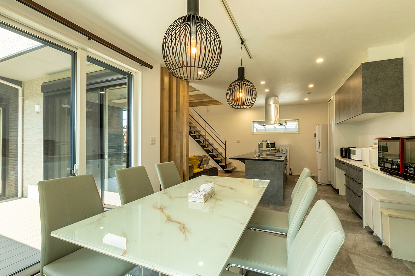 【DK】パン教室を開催されている奥様のご要望で設けた広々したDK空間。大きなテーブルを配置しても十分なスペースがあるので、楽しいひと時を過ごすことができます。