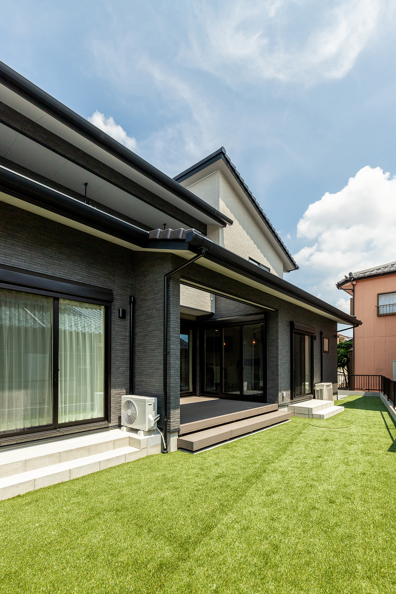 【中庭】リビングと一体となった中庭空間にはウッドデッキを設け、プール遊びやバーベキューなど多彩な遊びをすることができます。