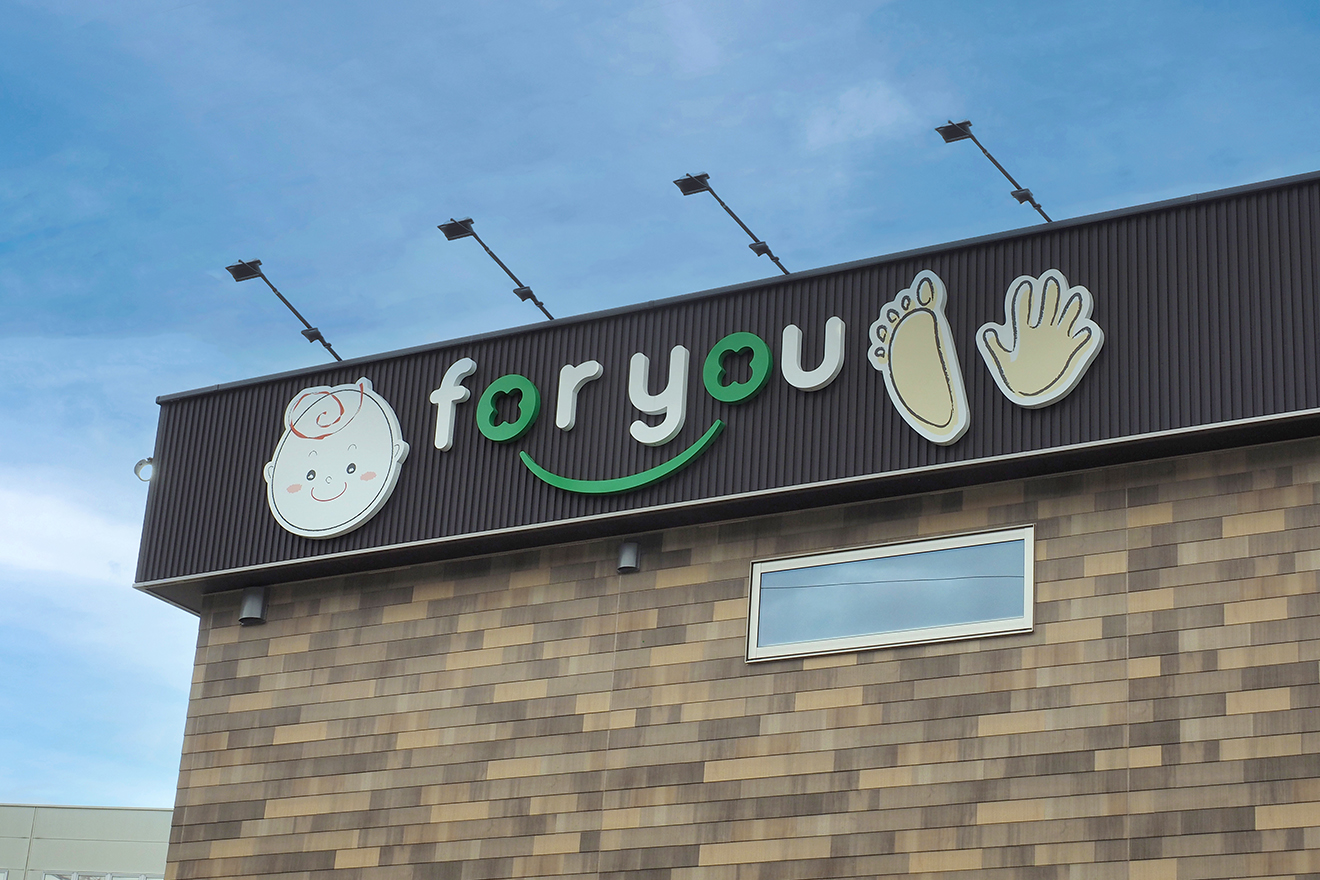 【看板】オリジナルの看板を当社でデザインし施工させて頂きました。 【入口】木調が印象的な外壁に入口を設けています。