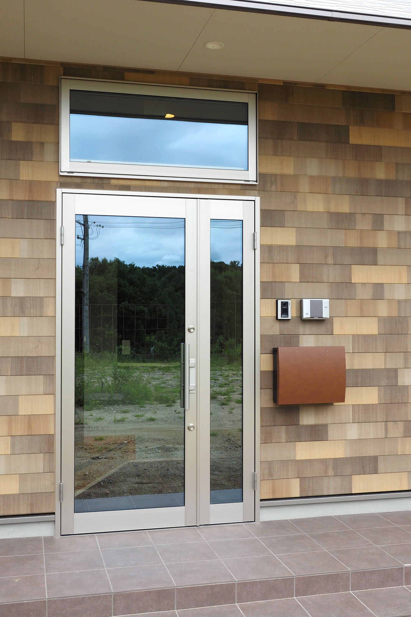【外観】店舗入り口と事務所入り口を分けた間取り。入口の屋根を一体的に施工することで雨の日も便利です。