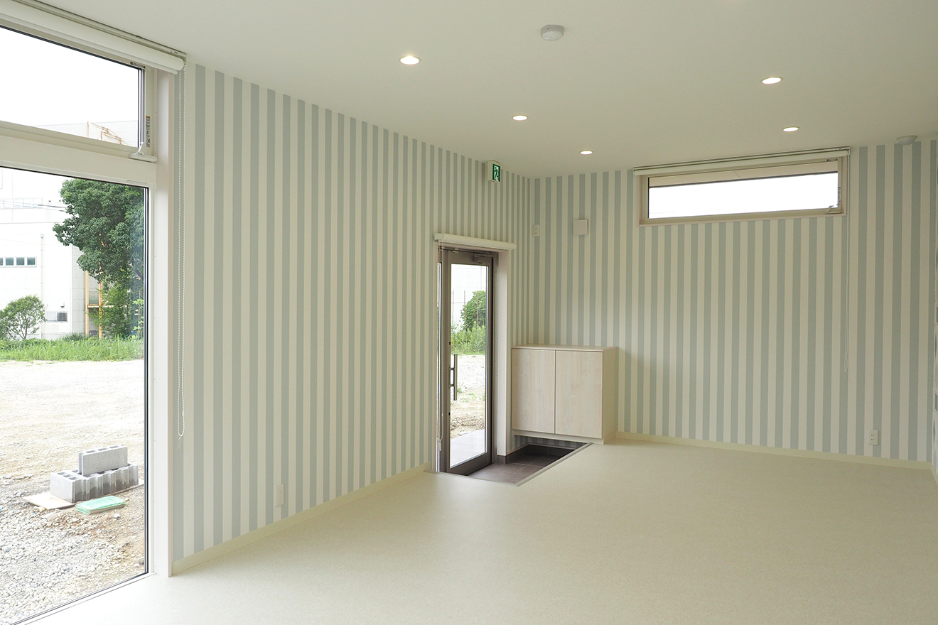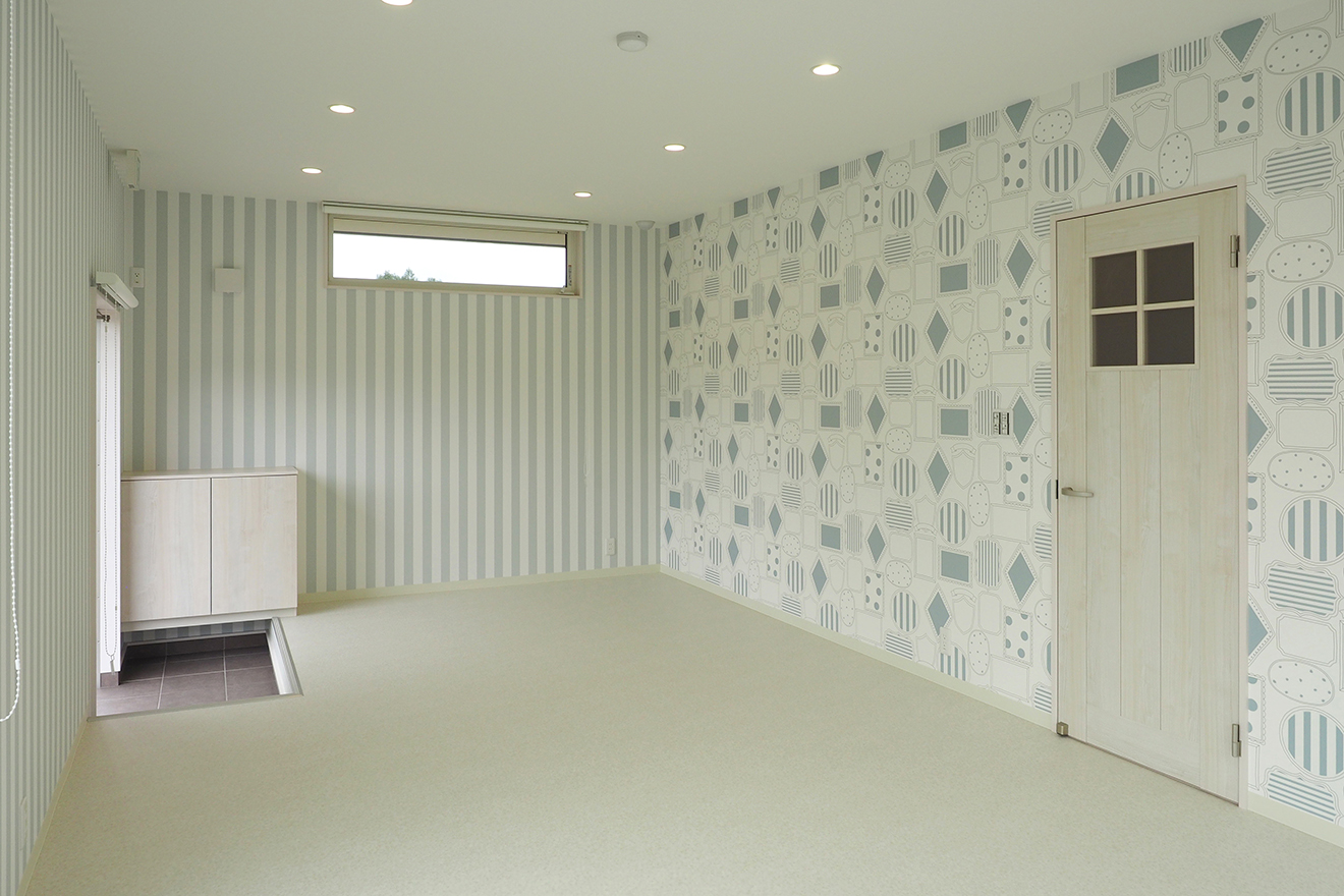【店舗内】明るく印象的なアクセントクロスを使用。外部から見やすく導入しやすい様、大きな開口のサッシを設けています。
