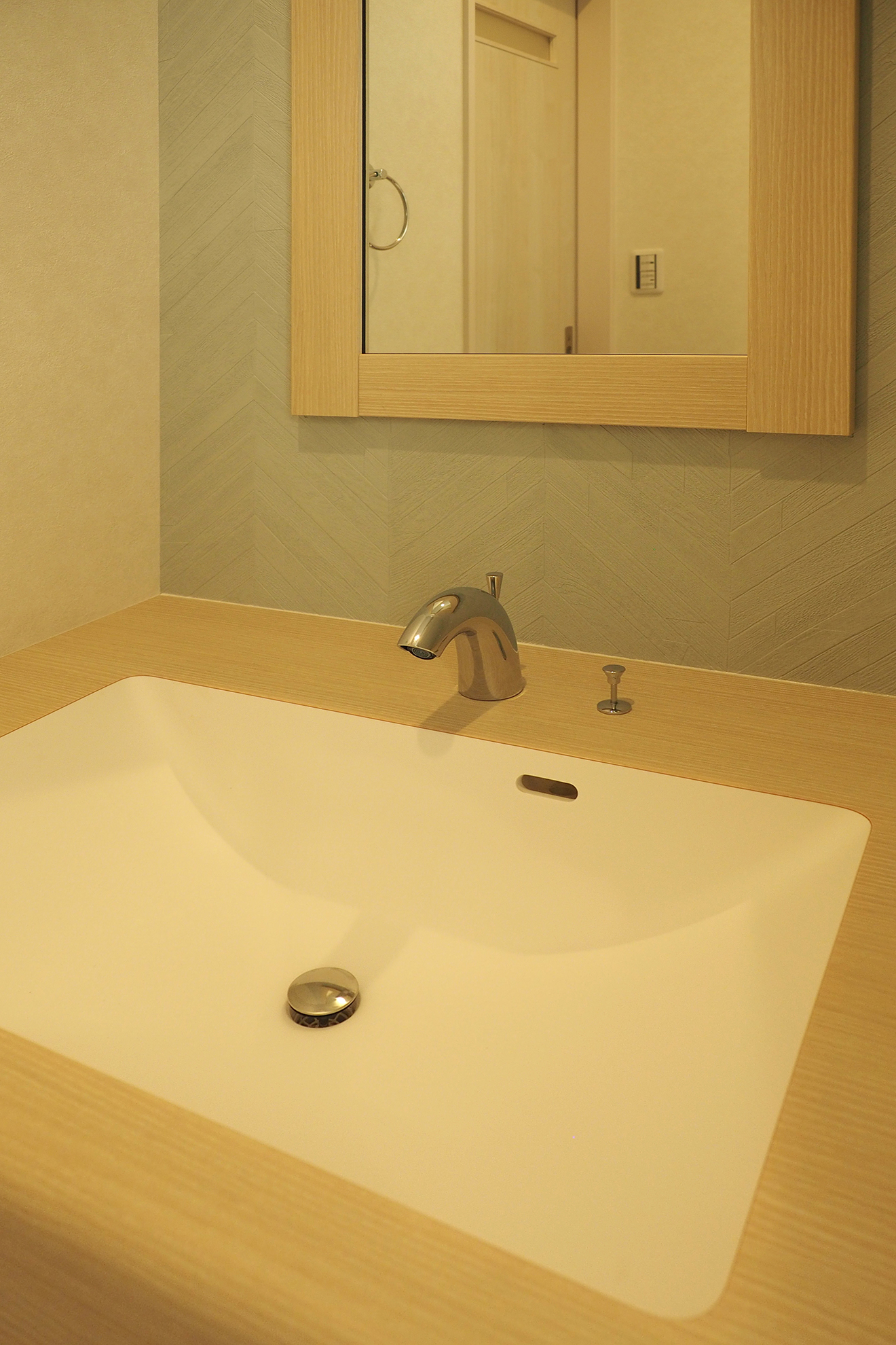 【階段】木調のクロスをアクセントとした階段室。単調な空間を遊び心ある動線に変えています。 【洗面】トイレ前に設けたオリジナルの手洗い器。色調は柔らかく、明るい色柄を選定しました。