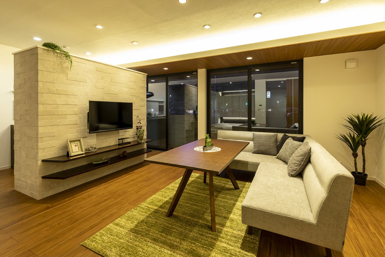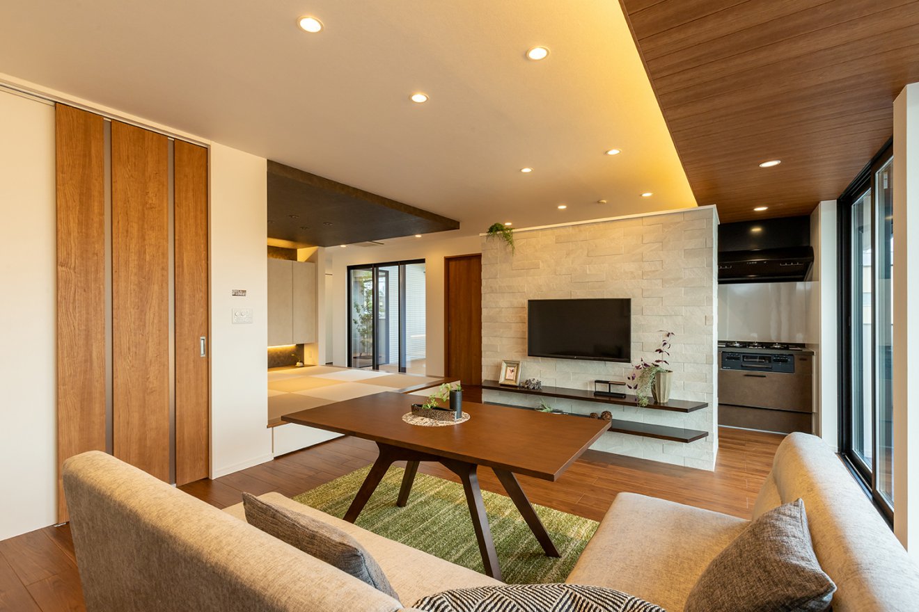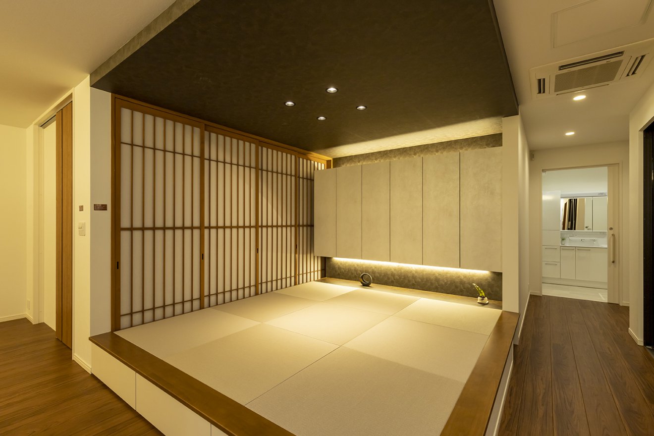 【夜景・親世帯LDK】小上がりのタタミコーナーを併設することで、窮屈さを解消しました。