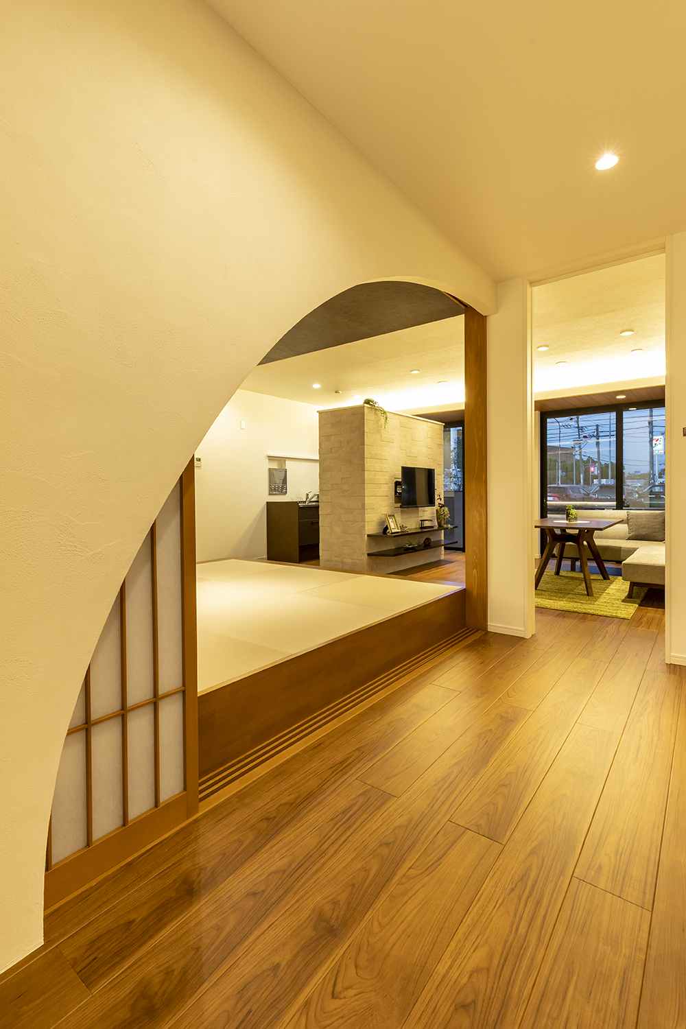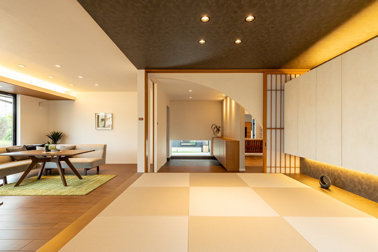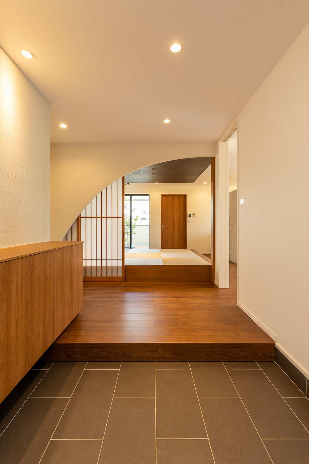【玄関ホール】障子戸を開けると親世帯のタタミコーナーと繋がります。中庭まで視線が抜けるため開放感抜群。