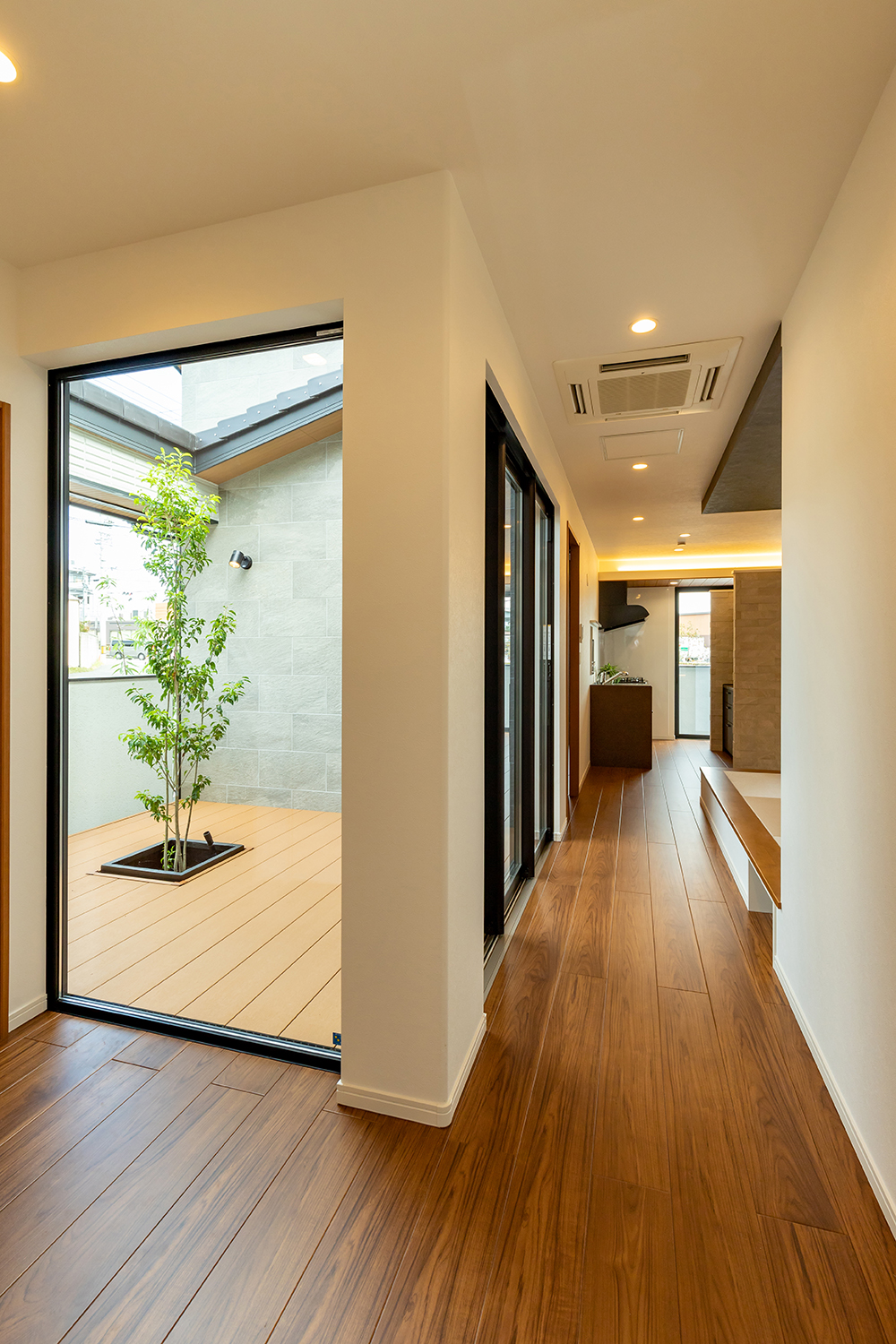 【中庭・親世帯主寝室】将来を見据えて広い開口の建具をセレクト。落ち着いた雰囲気に仕上げました。