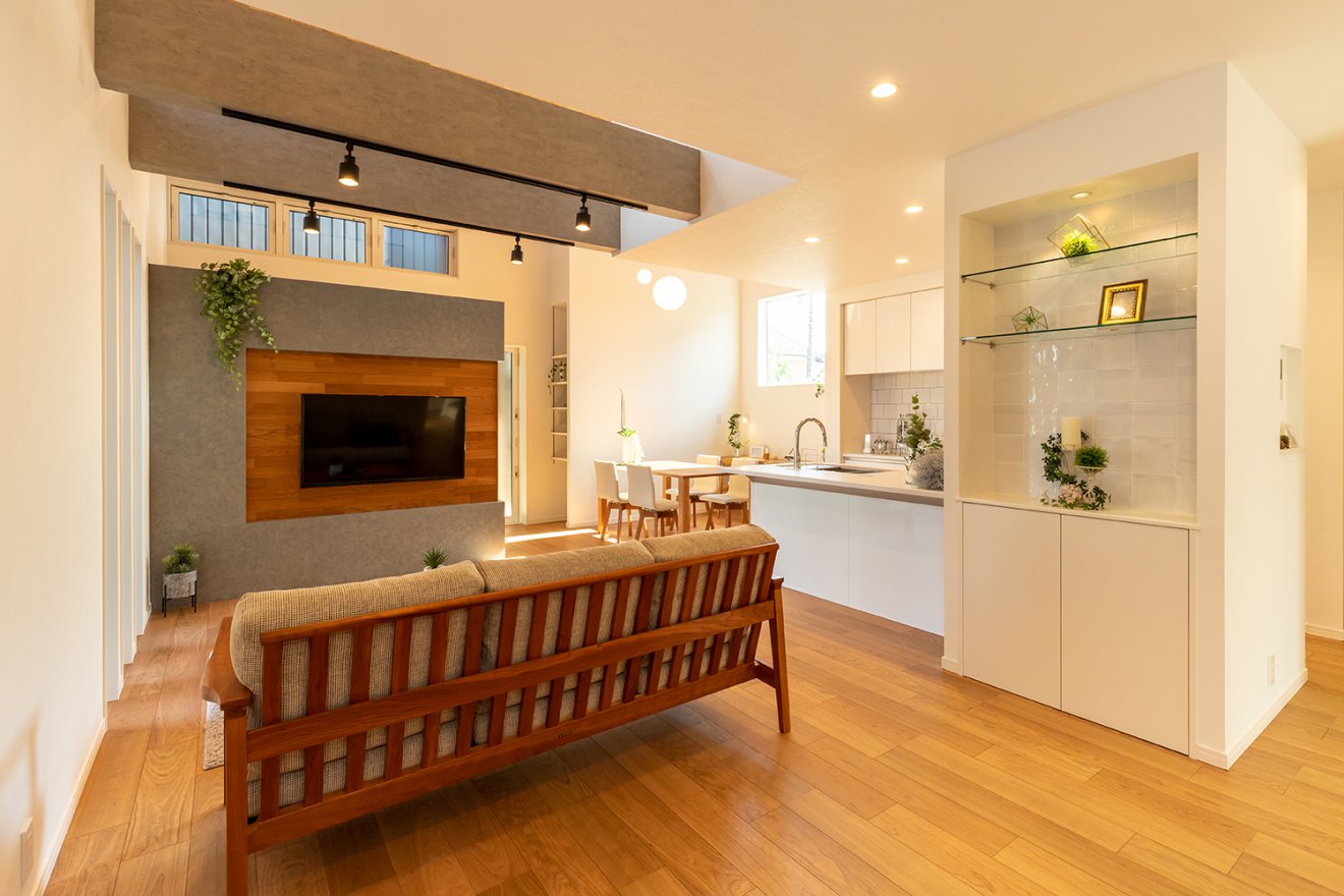 【子世帯LDK】リビングのTVボード裏に収納空間を設けることで、急な来客の際に細々したものをサッと隠せて便利です。