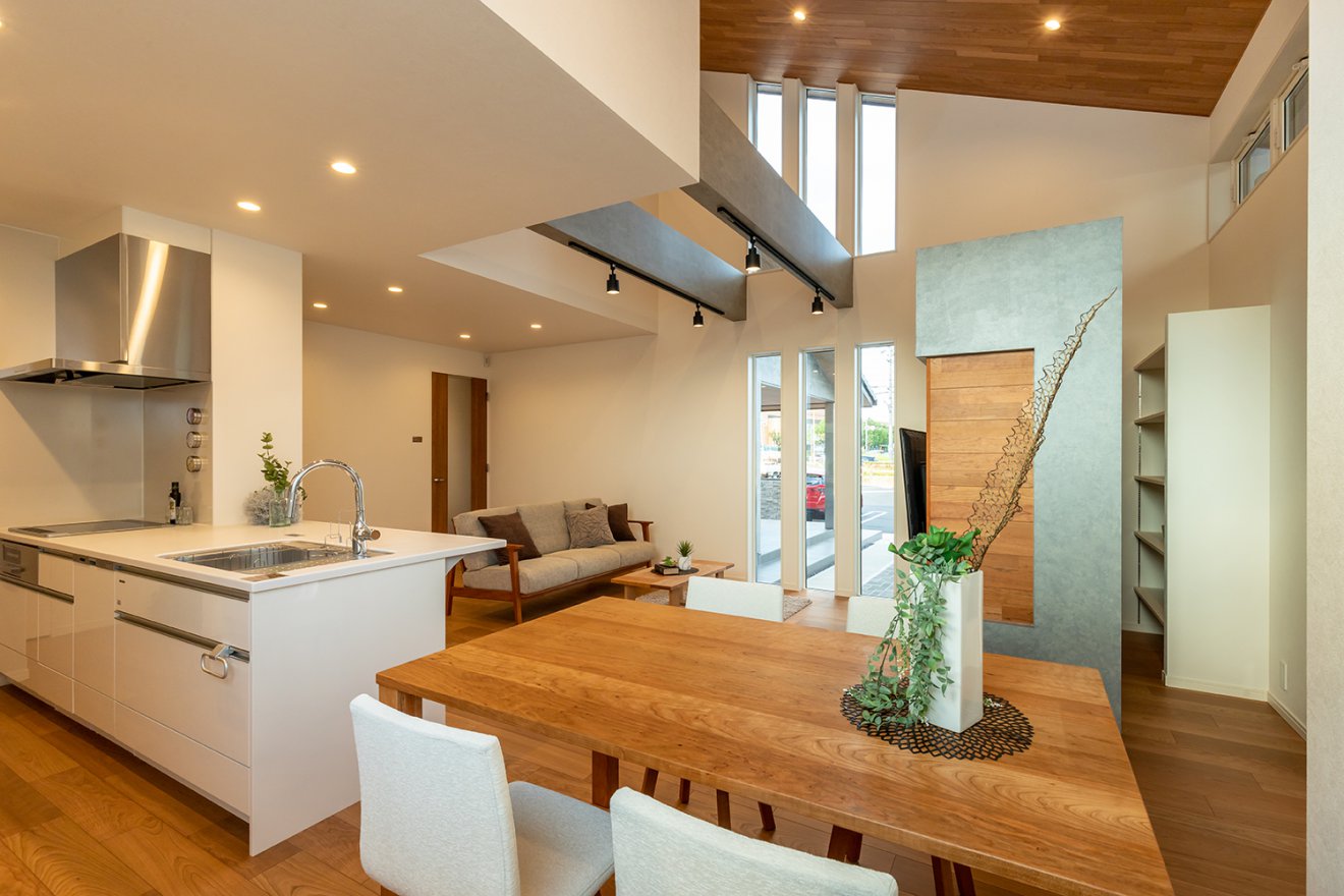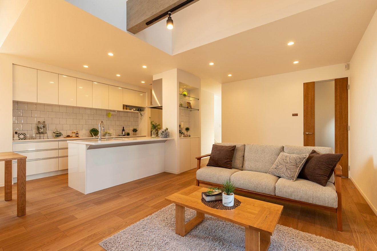 【子世帯LDK】子世帯のリビングは高天井とし、勾配を設けました。木目の突板とコンクリート調の見せ梁で調和のとれた空間を演出しています。