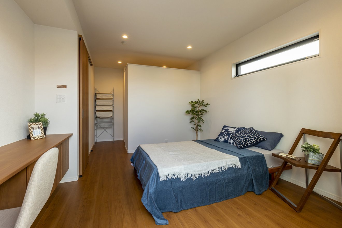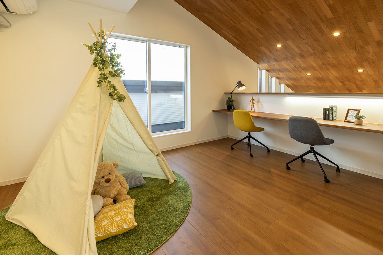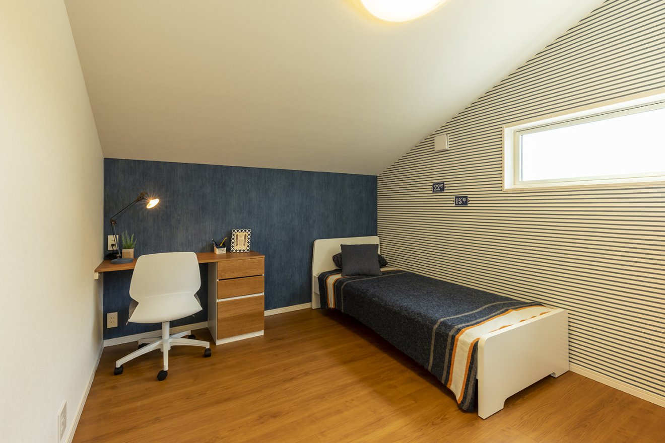 【洋室】斜め天井が特徴的な6.3帖の子供部屋です。 【子世帯主寝室】子世帯主寝室のTVボードはオリジナル家具。下部の空間には椅子を置くことができ、メイクやちょっとした書き物にも利用できます。