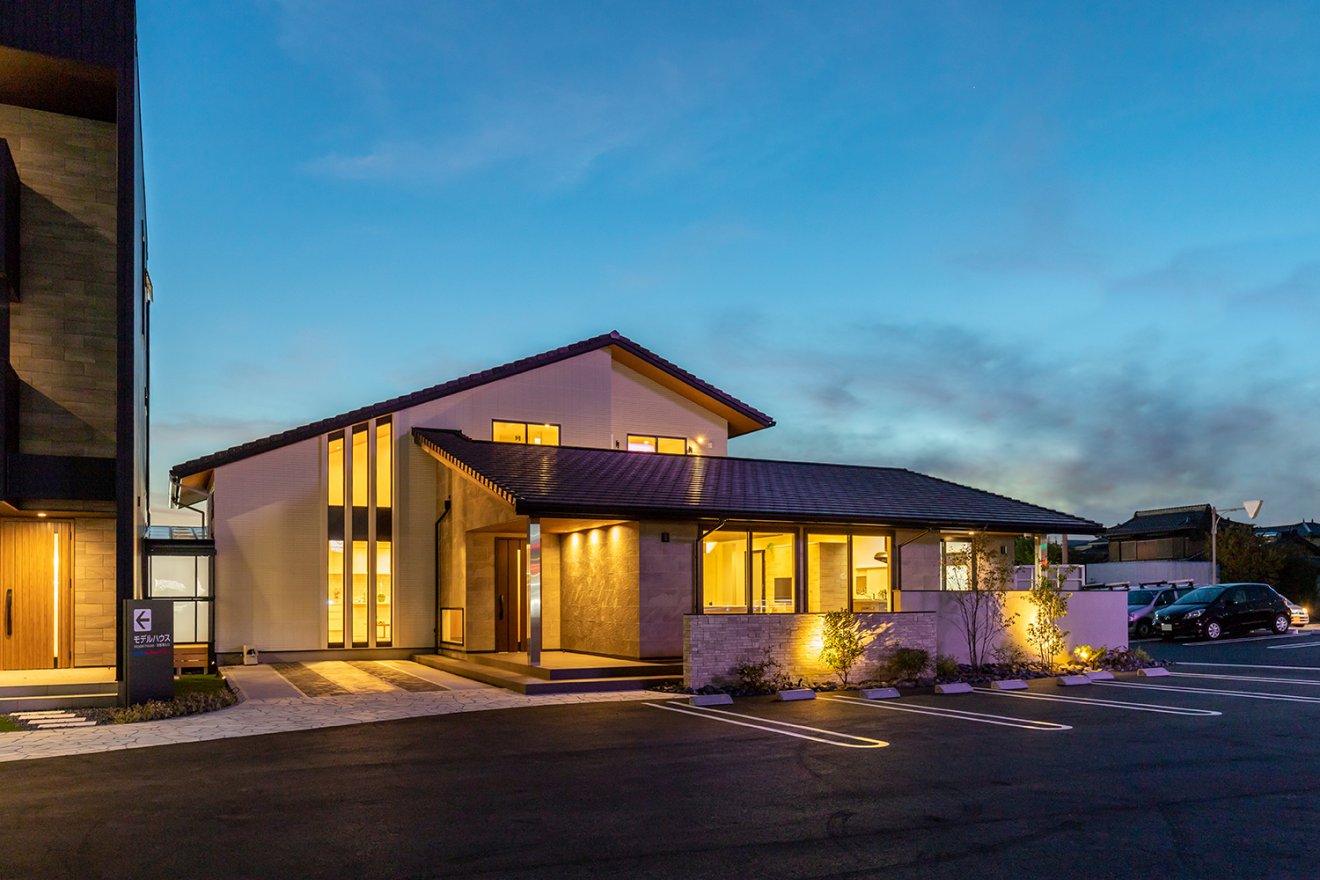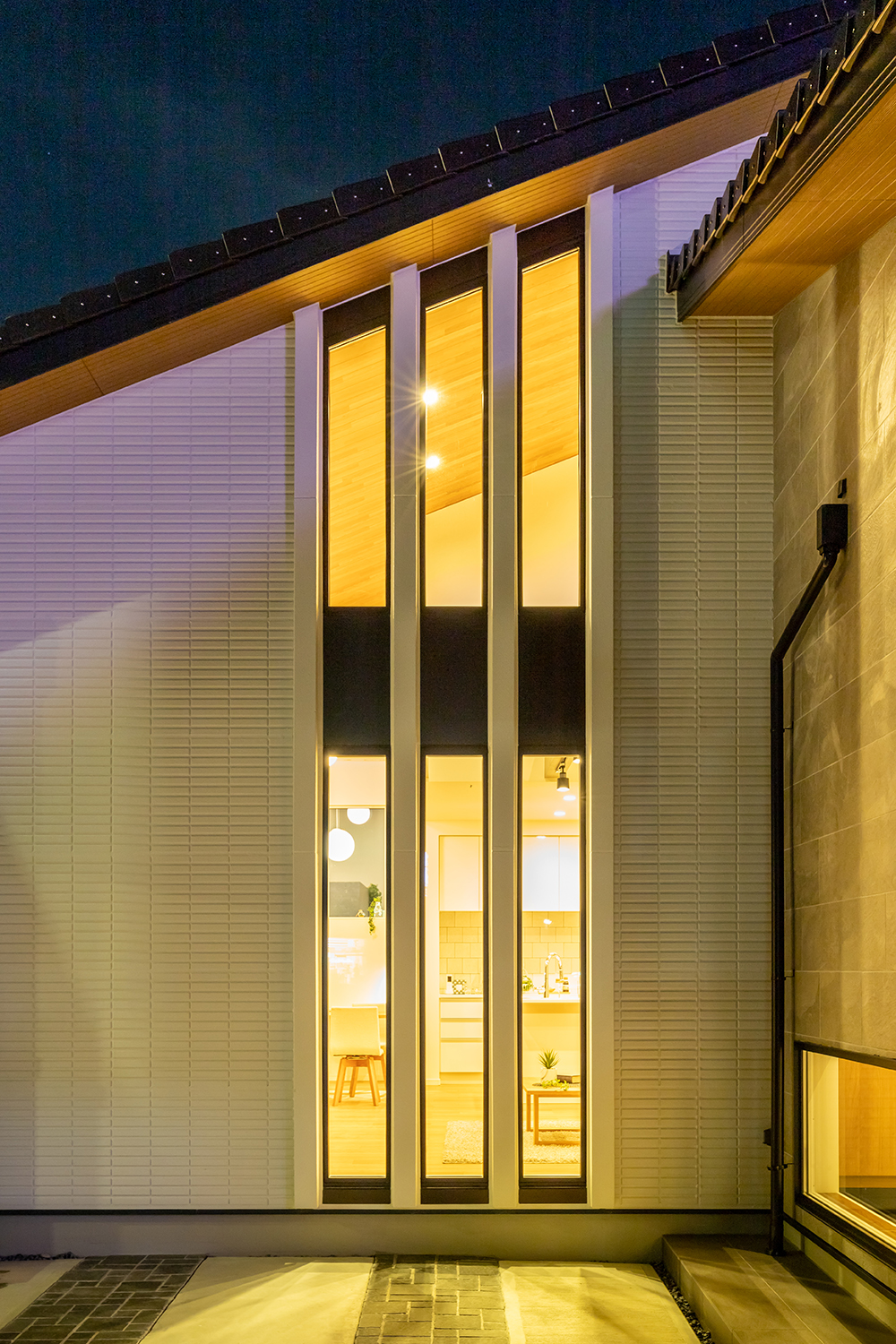 【夜景・外観】重厚感のある大屋根と子世帯LDKの吹抜けを利用した大きな窓が特徴的。