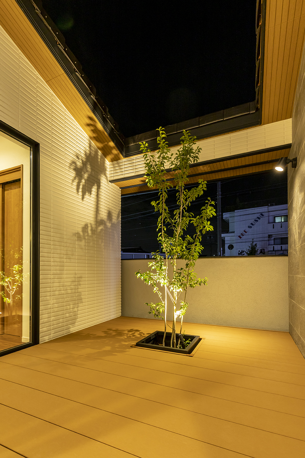 【夜景・中庭・玄関ホール】中庭のデッキから夜景を眺められます。玄関ホールから目に入るR形状の壁はインパクト十分なアクセントに。