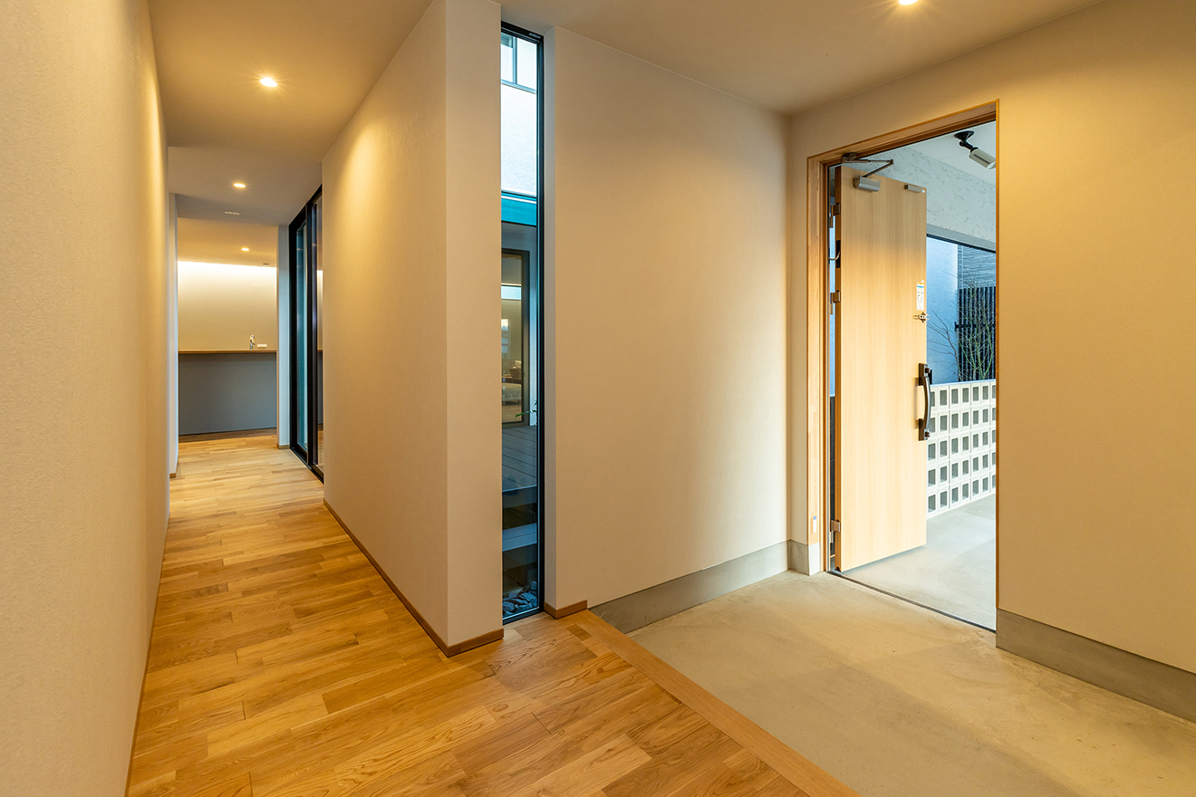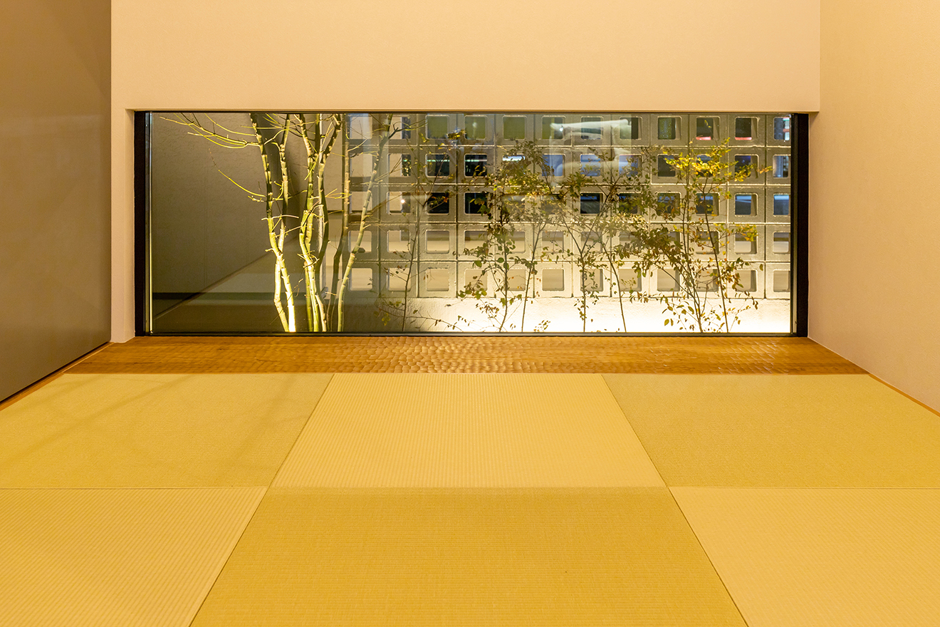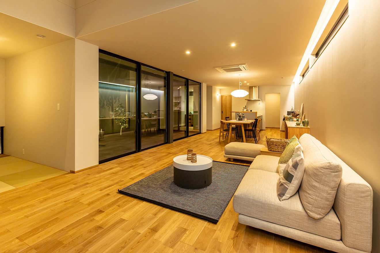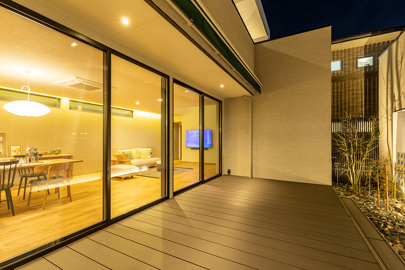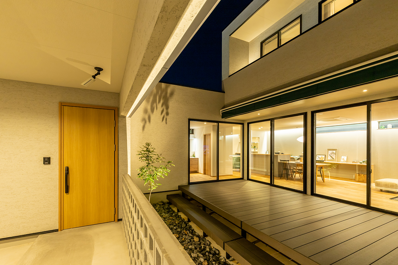 【夜景・中庭】リビングと大開口で繋がっているので、室内に奥行きと開放感を生み出しています。また、植栽やガレージが目隠しとなるため、外からの視線を気にすることなく過ごせます。