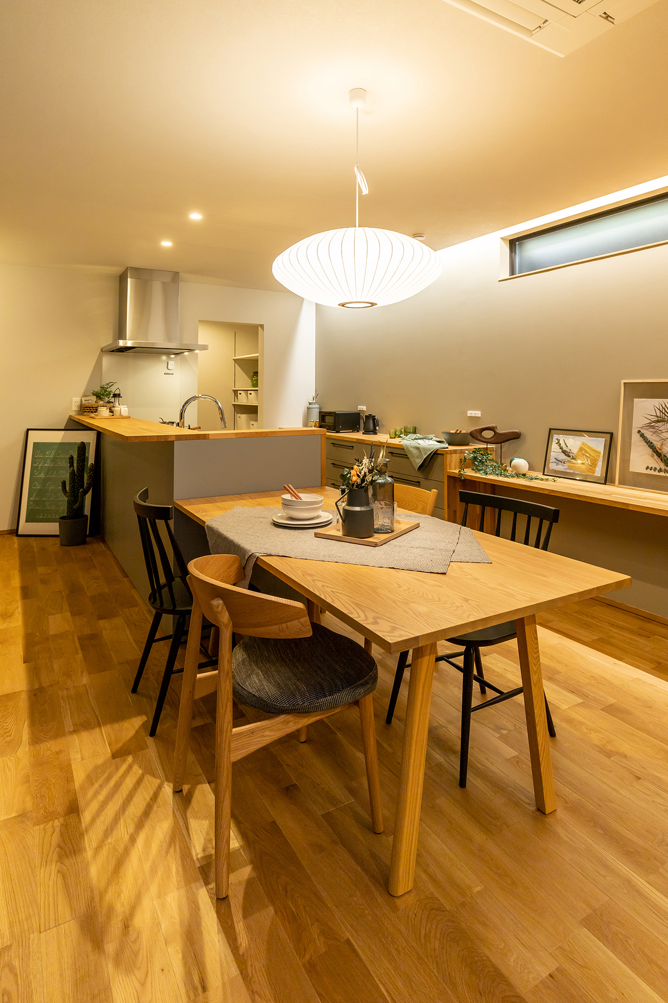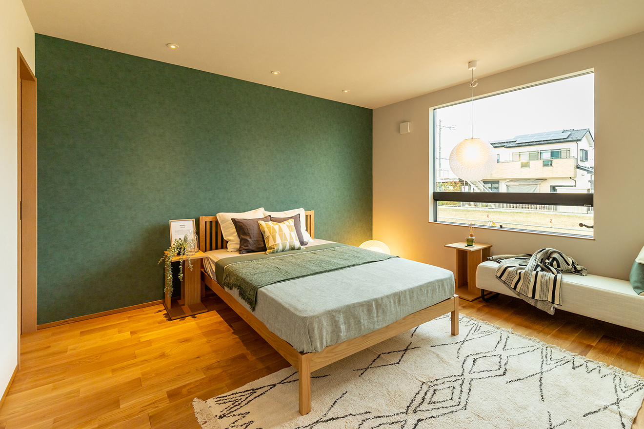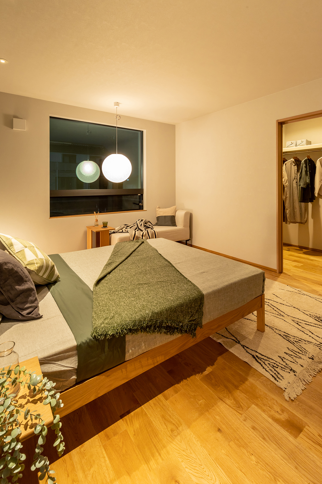 【夜景・和室】座った時に外の景色を楽しめるように地窓を設置。 【夜景・主寝室】読書や趣味を楽しむだけでなく、テレワークルームとしても利用できるようにデザインしました。