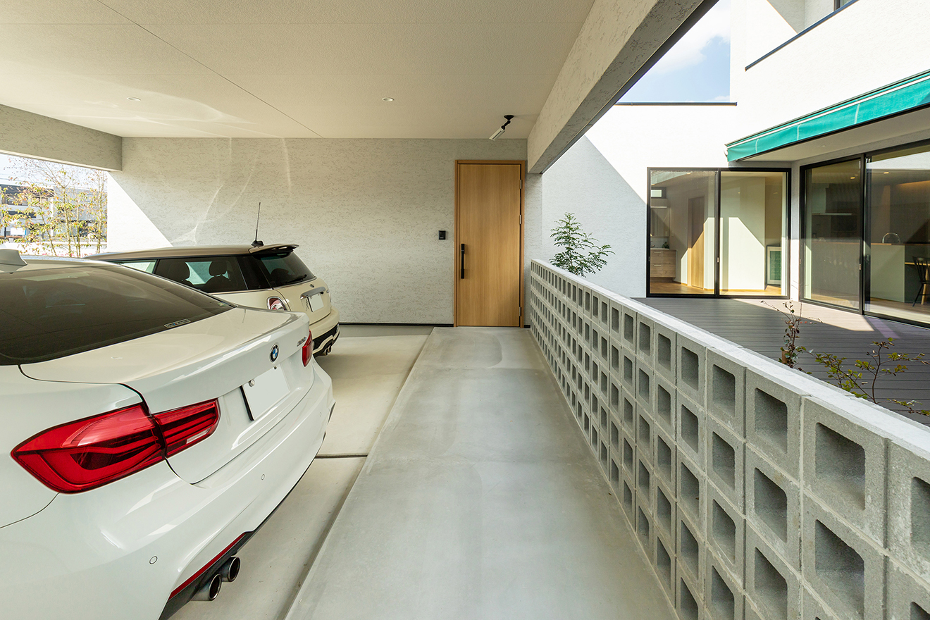 【インナーガレージ】雨に濡れずに室内に出入りすることができるインナーガレージ。車2台が余裕をもって停められます。 【玄関】土間仕様でスペースに余裕があるので、アウトドア用品やベビーカー、外遊びで使うおもちゃなど、大き目のアイテムの収納場所としても最適です。