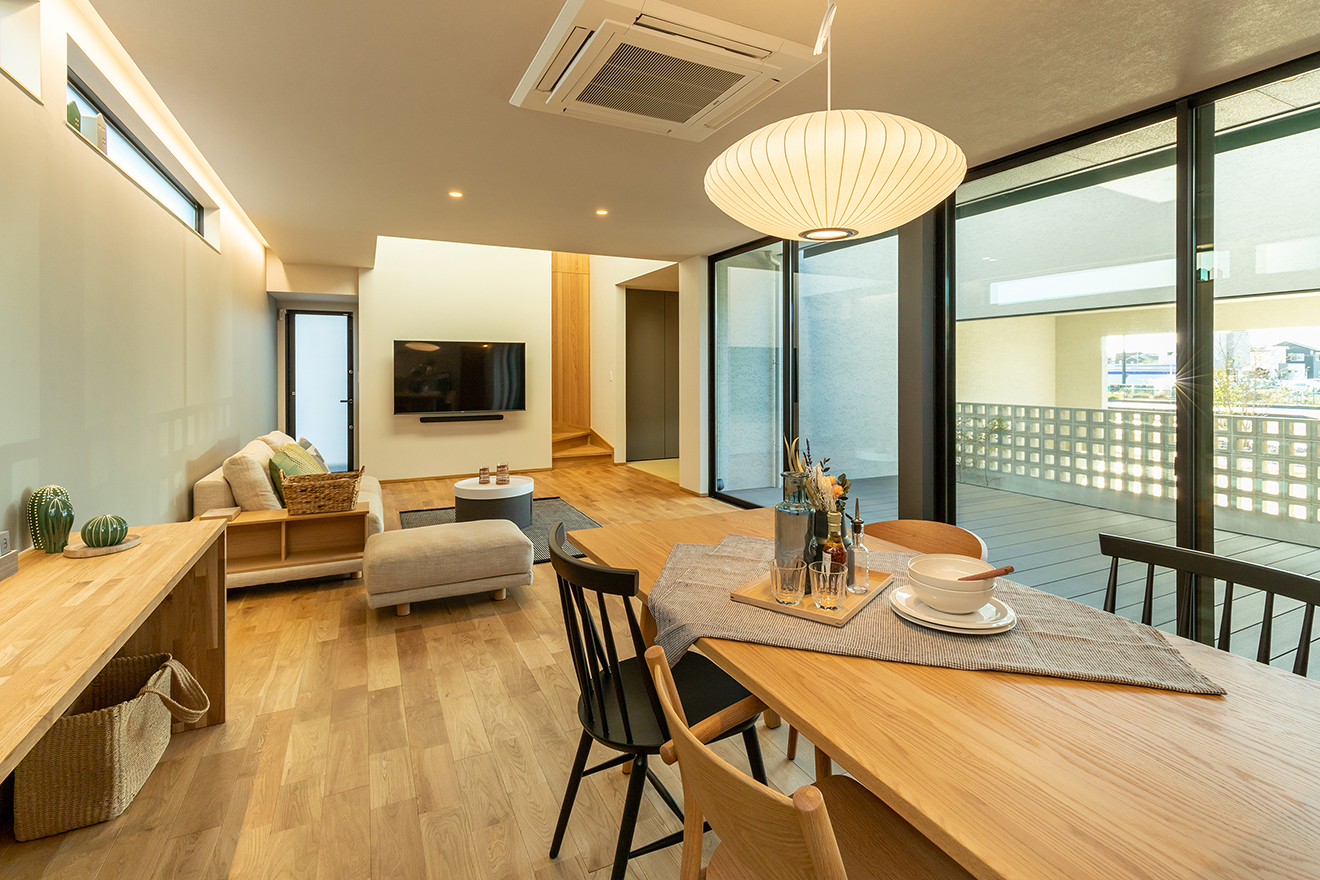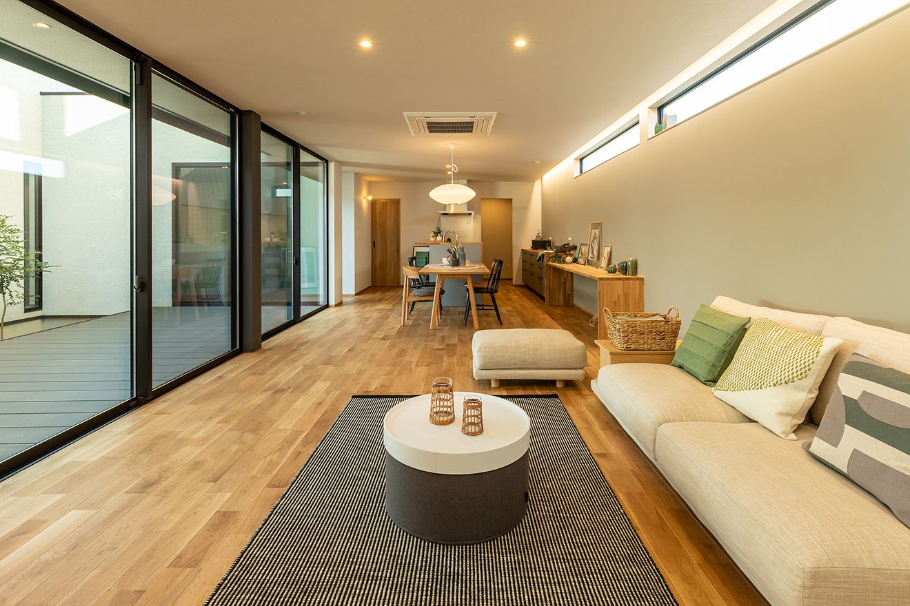 【LDK】中庭へとつながる大開口のサッシによって生み出される、開放感が心地よいリビング。