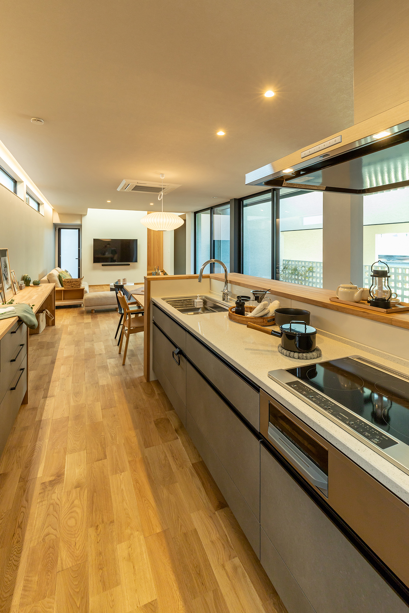 【LDK】ダイニングやキッチンからリビング全体を見渡せるため、料理や家事をしながら外で遊ぶ子供たちの姿を見守ることが可能です。