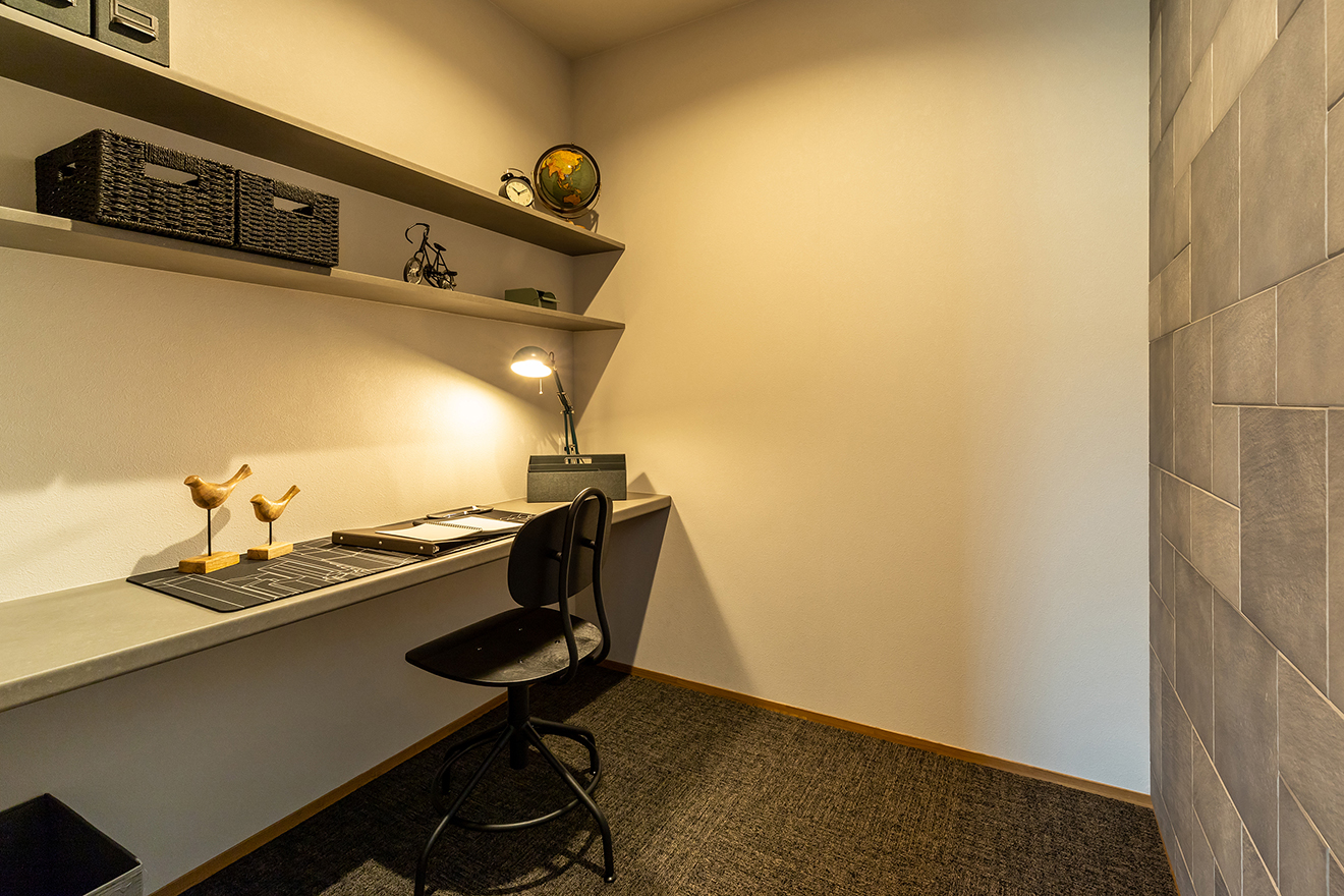 【主寝室】8.4帖の広々空間に書斎とウォークインクローゼットを設けました。 【WIC】ちょっぴり贅沢に、床には絨毯を敷きカウンター背面にエコカラットを施しています。