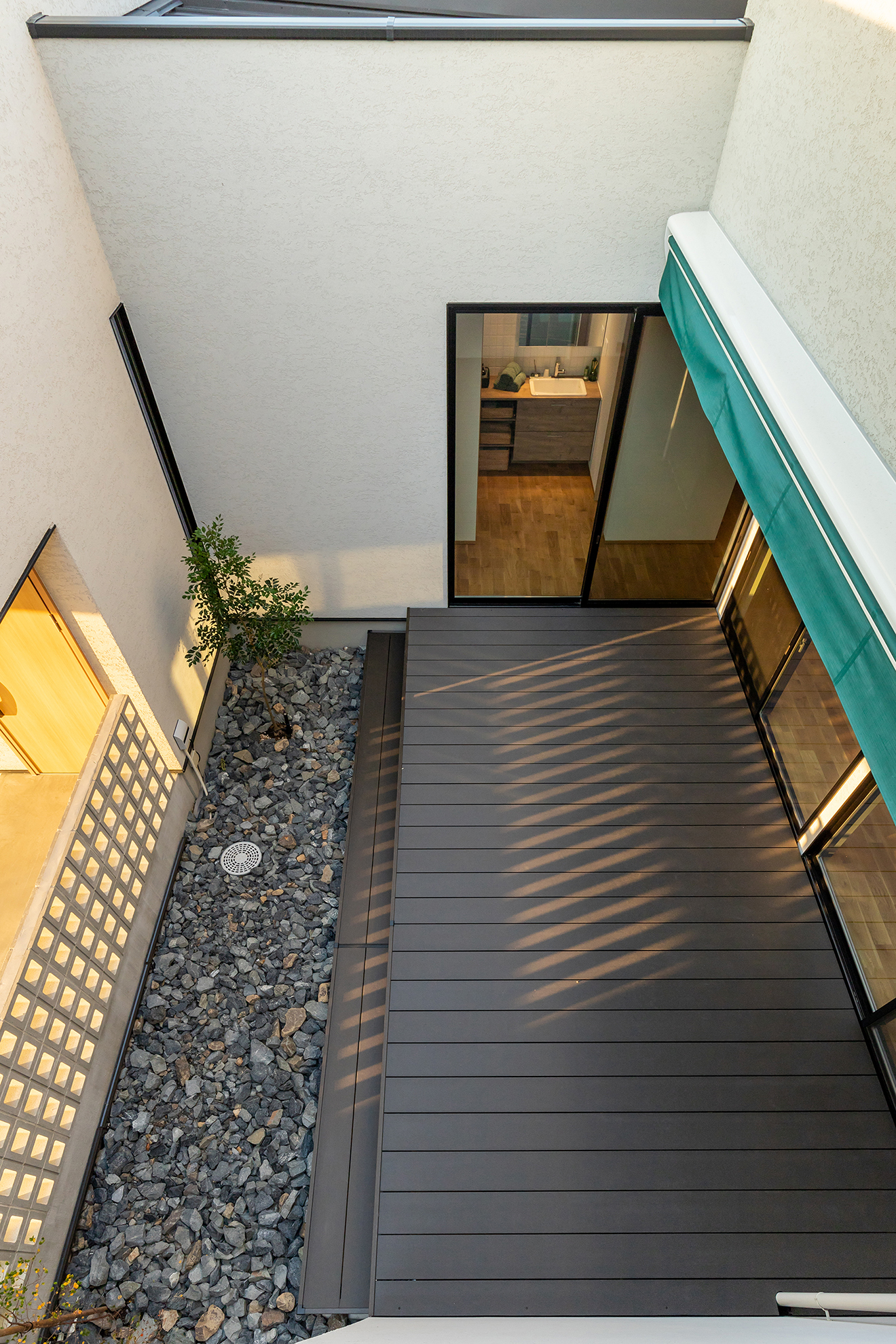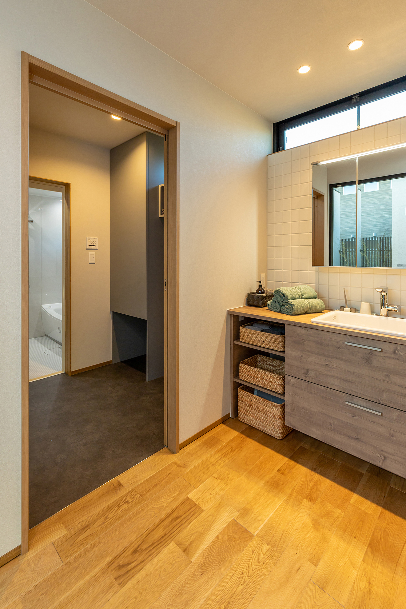 【洗面】幅1.35mのゆとりある空間に、使いやすくオシャレな造作洗面カウンターを据え付けました。2人並んで身支度できるので朝の忙しい時間に助かります。 【中庭】外部からの視線が気になりにくい中庭はアウトドアリビングとしても利用でき、家族でゆったりと過ごせます。
