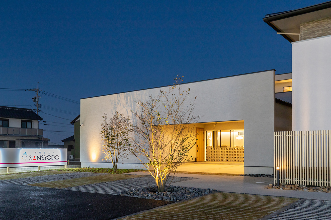 【夜景・外観】大きくスクエアに開いた印象的なファサードの先には、インナーガレージと中庭が続きます。