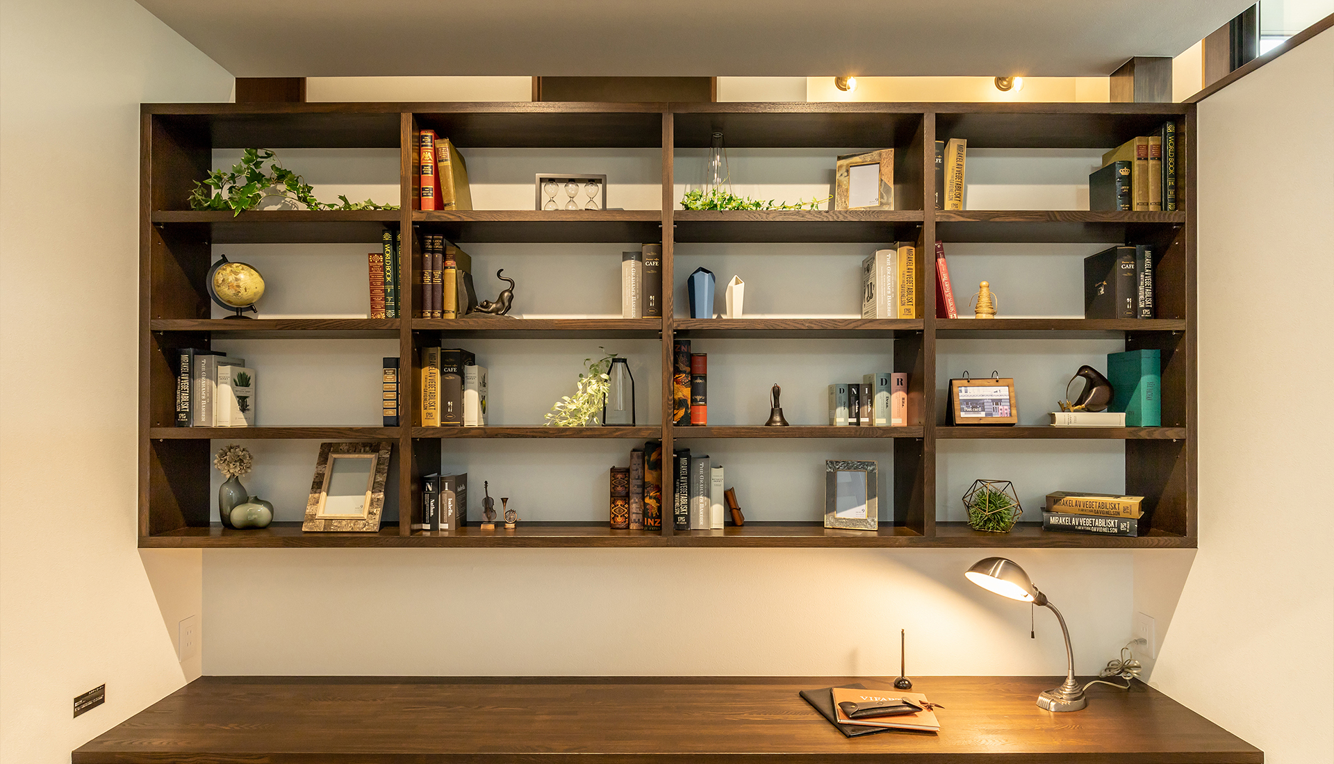 主寝室に続く廊下はあえて天井を下げることでこもり感のある書斎に。