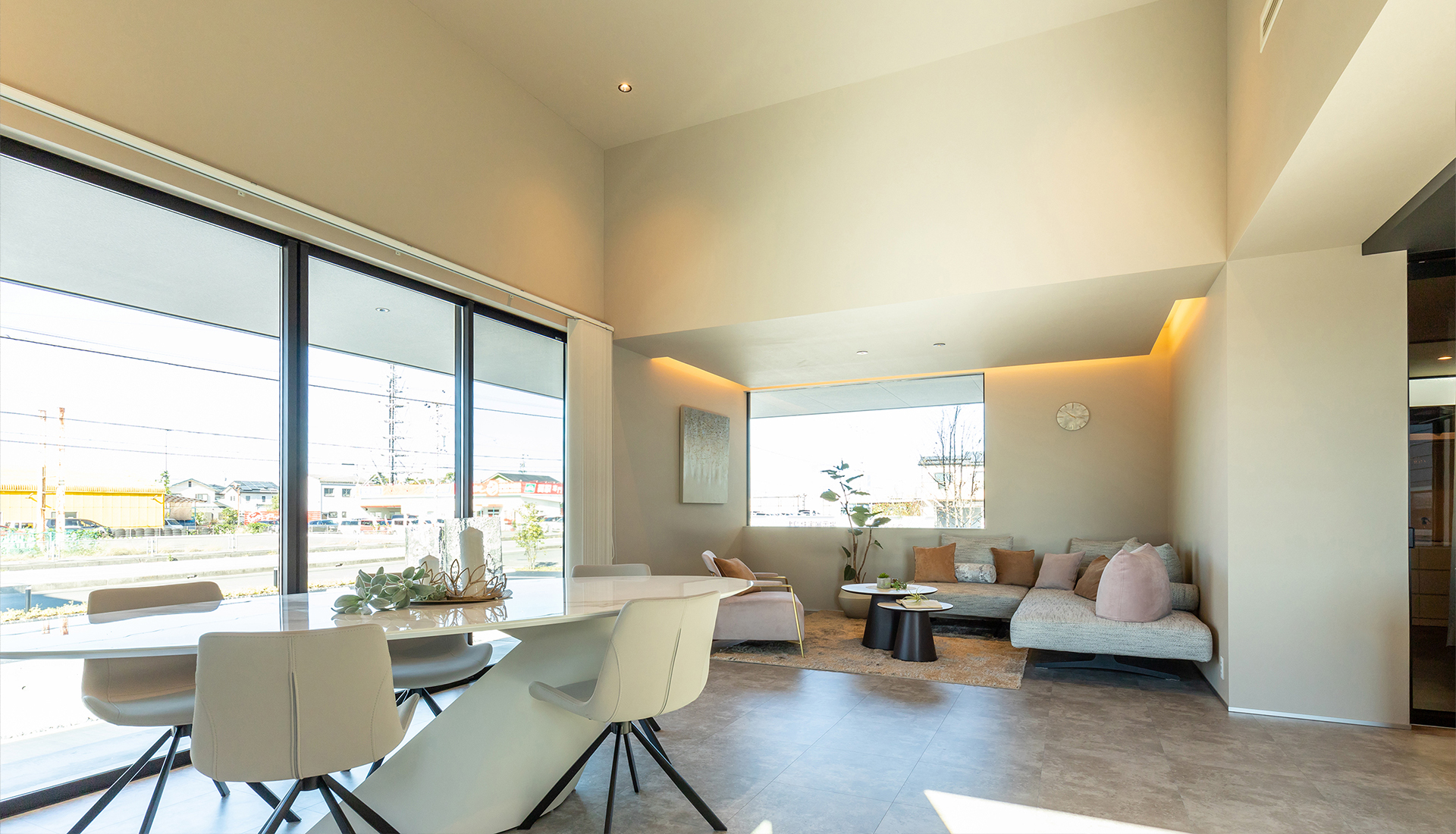 ダークカラーの天井にエッジの効いた吹き抜けを設けました。大開口のサッシから降り注ぐ陽光がダイニングを照らします。
