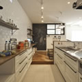 ヴィンテージアイテムにも馴染むように、木目が印象的な床材を採用。斜め貼りにすることで空間に奥行きを持たせ、軽やかさを演出しています。壁にはタイルを用い、温かさと懐かしさを表現しました。