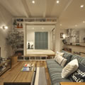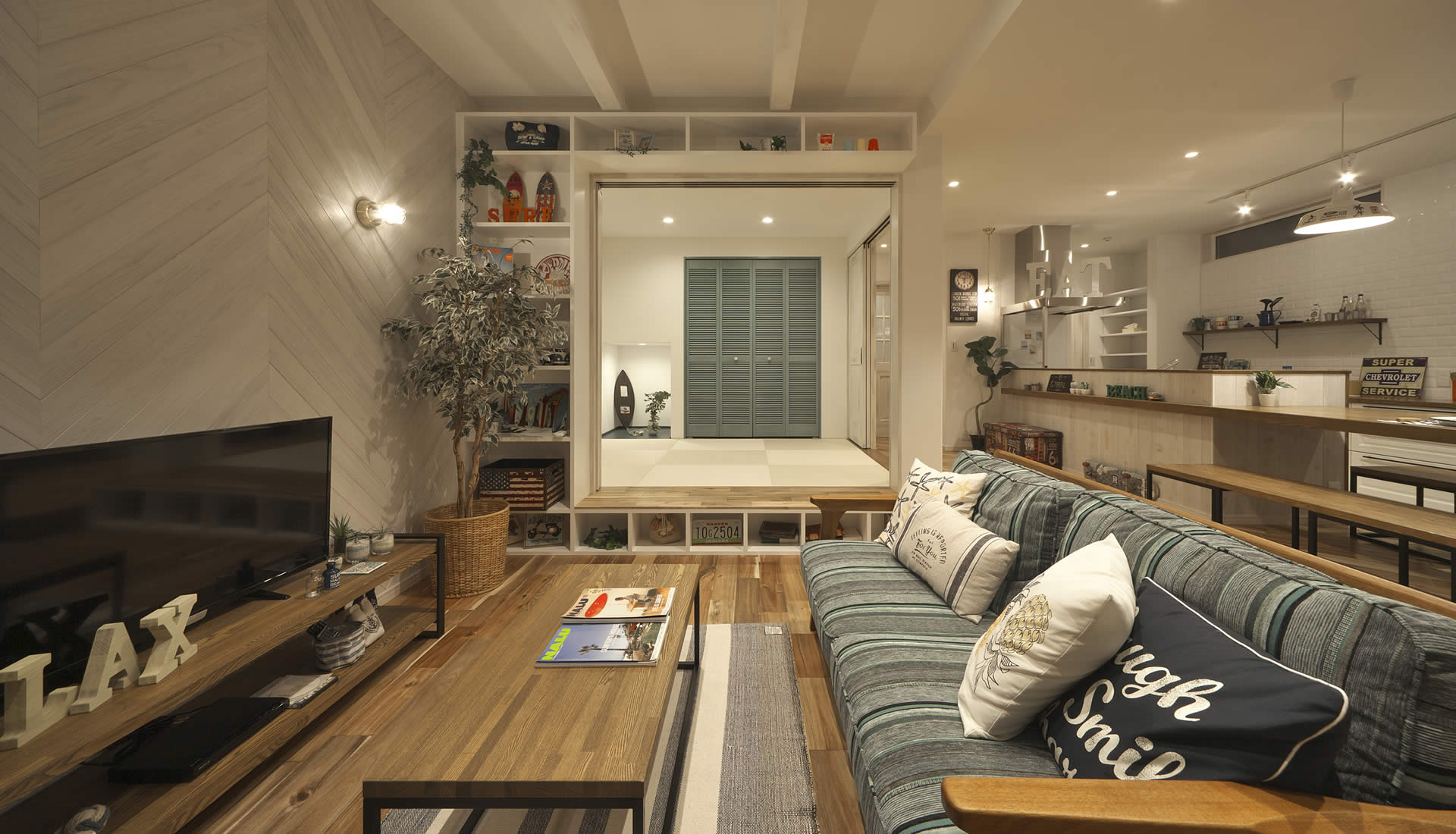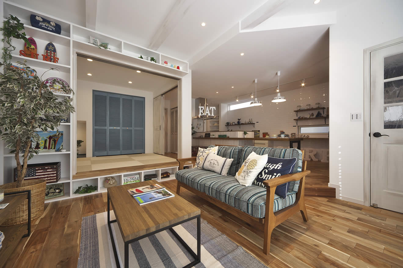 オフホワイトとライトブルーを基調としたカリフォルニアスタイルのリビング。キッチン・ダイニングとはフロアの高さを変えて、空間にメリハリを付けています。また、小上がりの畳スペースも建具のテイストを揃え、部屋の雰囲気に溶け込ませました。