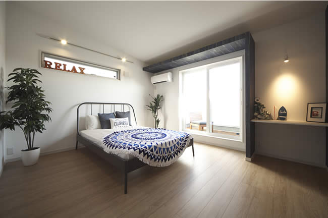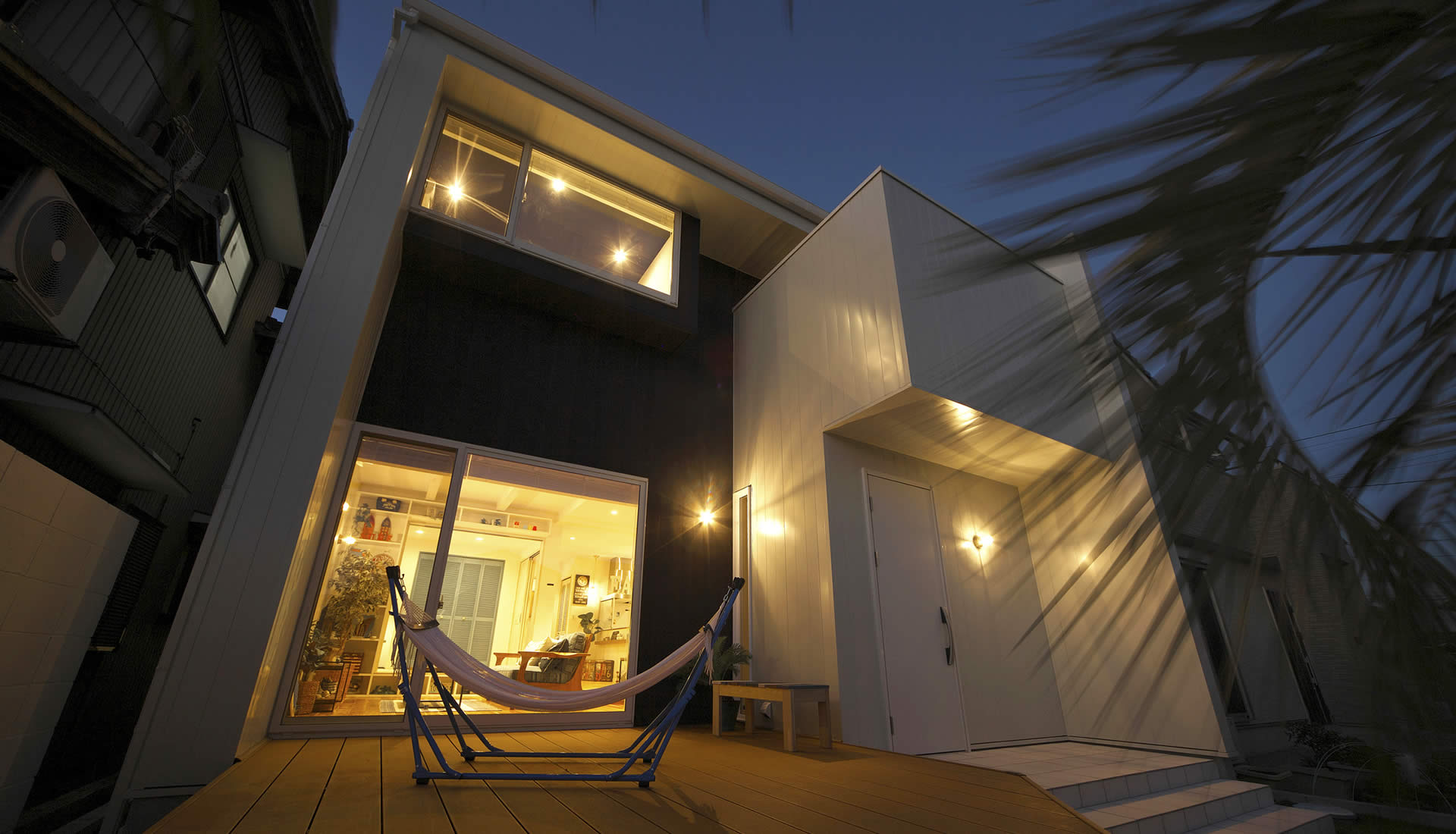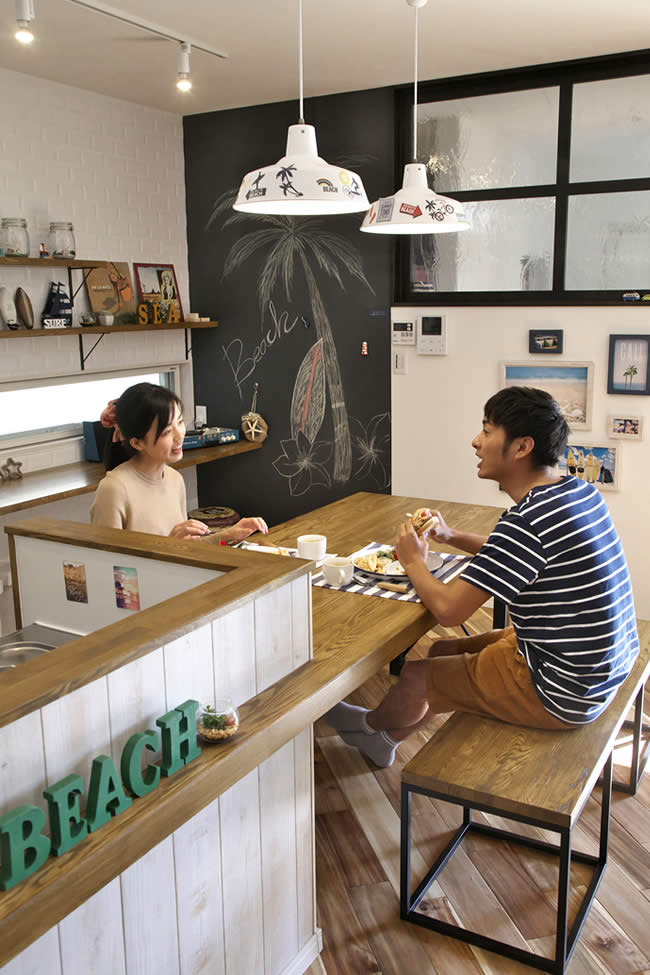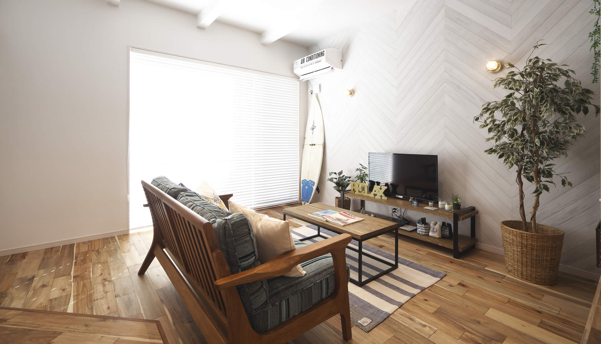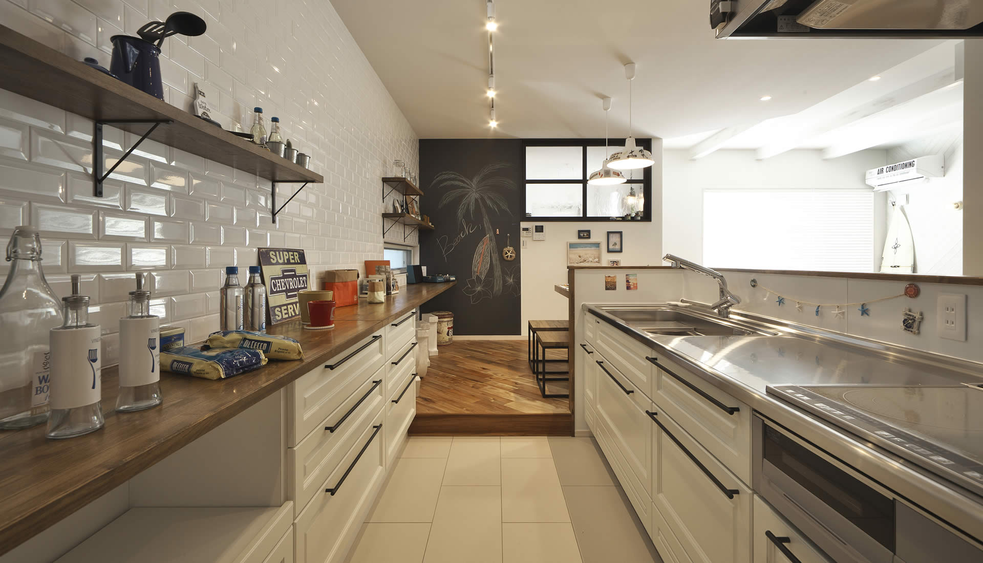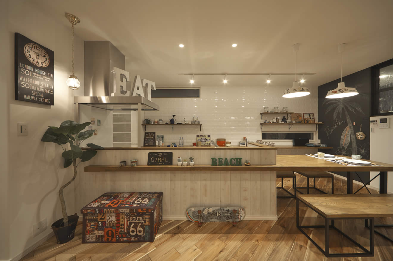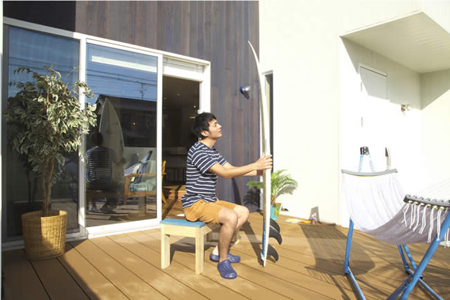 素材感があり使い込まれた質感の木材を使い、カリフォルニアスタイルの特徴であるナチュラルなヴィンテージ感を表現しました。また、リビングにつながるウッドデッキが開放感を演出。青空のもと、サーフボードのお手入れをするのも気持ちよさそうですね。
