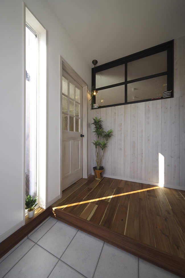 LDKと玄関の間に室内窓を設けました。また、リビングドアも格子窓付のものをセレクト。どちらにも揺らめく水面を思わせるデザインガラスをはめ込みました。室内の灯りが柔らかく広がり、家族の温かな雰囲気が伝わってきます。