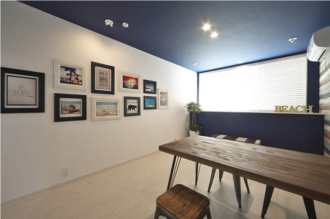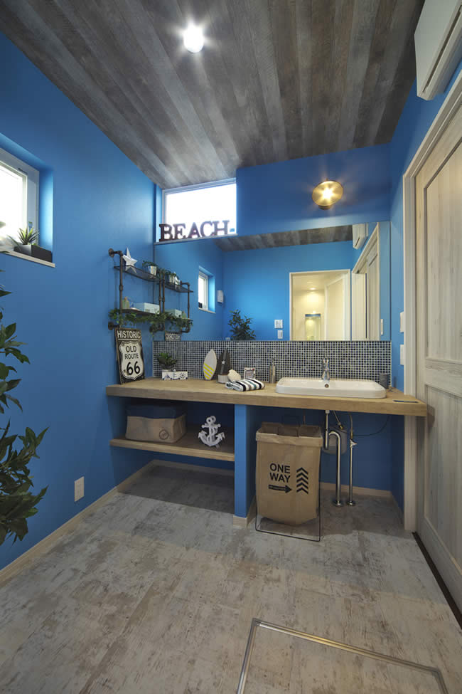 鮮やかなブルーの壁が目を引くサニタリールーム。カウンターやフロア、天井は使い込まれた古材調の素材を合わせました。モザイクタイルの表情や、あえてスケルトンにした配管が、サーフショップを思わせるレトロポップなコーディネートです。