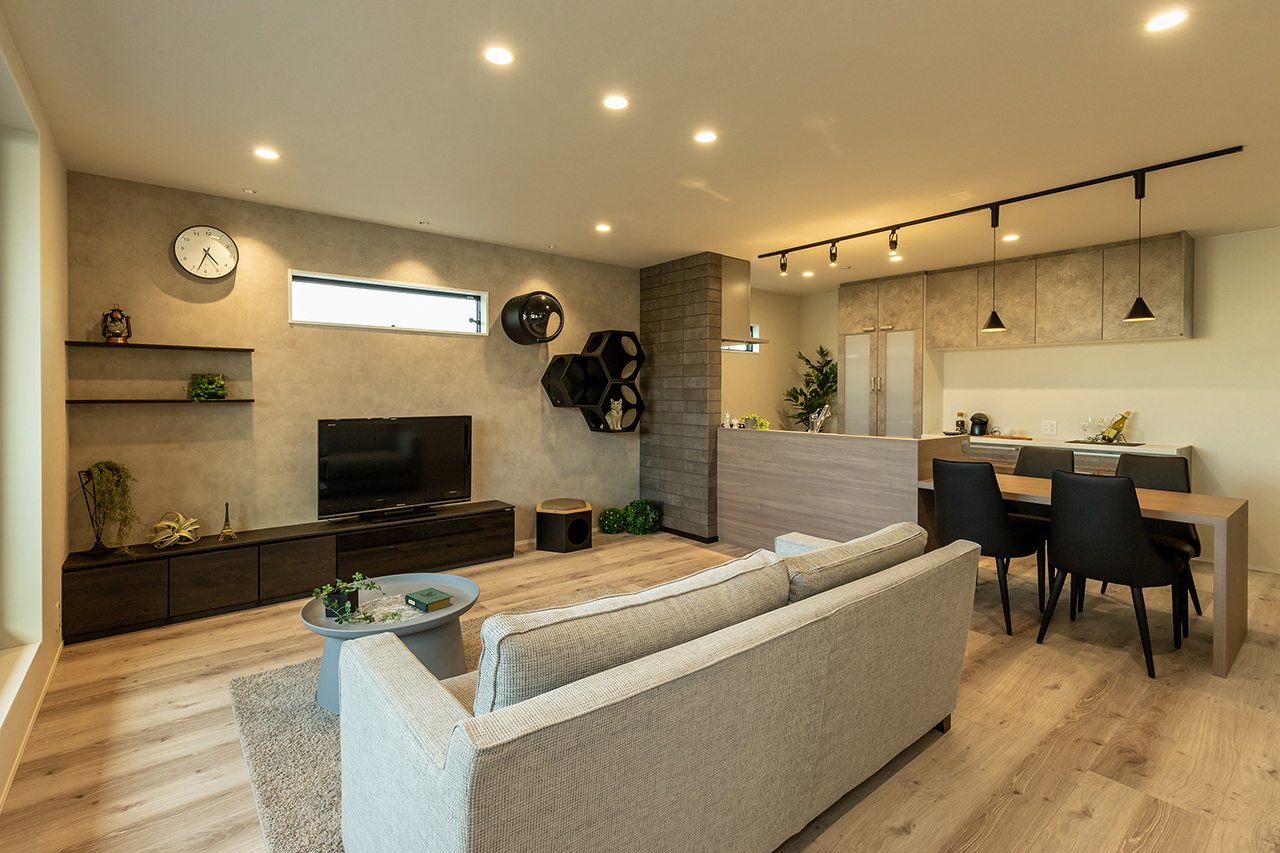 ダウンフロアで視線の変化を楽しむ空間です。TVボード面はシンプルにまとめました。 -