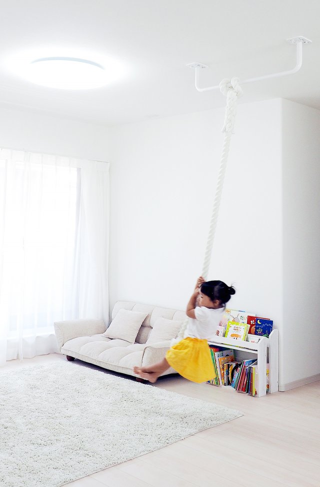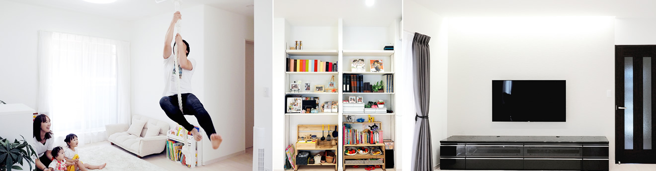 奥様 育児休暇中に子供2人の面倒を見ていると、気軽に外へ出かける事は中々出来ませんでした。そんな時、息抜きを兼ねて2階のフリースペースへいくと気分が変わりました。子供たちもフリースペースで遊ぶことが大好きなので、本当に作って良かったです。特に長女は体を動かすことが得意で、懸垂バーにロープを括り付けて、毎日ロープ遊びをしていますよ。