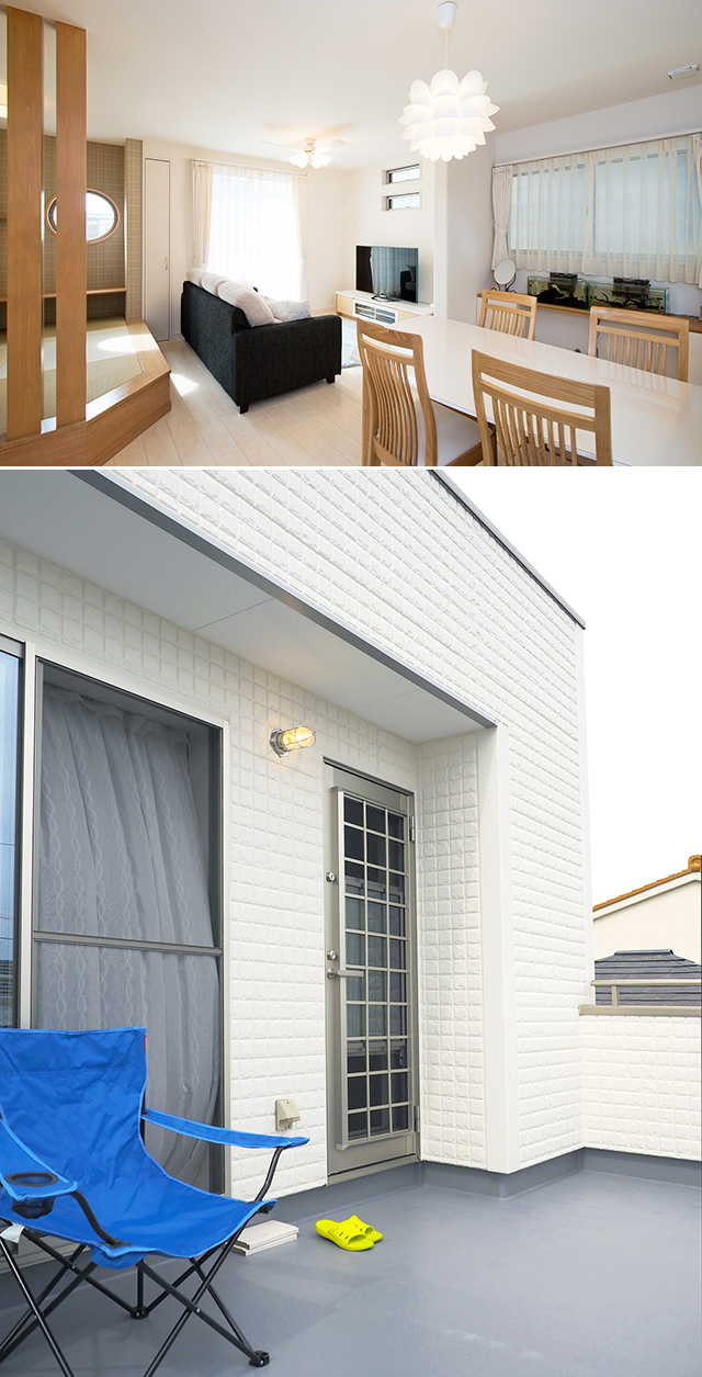 ご要望の一つだった広いバルコニーで、ご夫婦がゆったりと贅沢な時間を過ごされているのを拝見し、そのお手伝いが出来た事をとても嬉しく思います。 宝くじが当たれば今度は平屋で…と笑って話されていたY様ですが、ご家族が増えたりと生活スタイルが変わる際には、また私達にお手伝いさせて頂ければ幸いです。