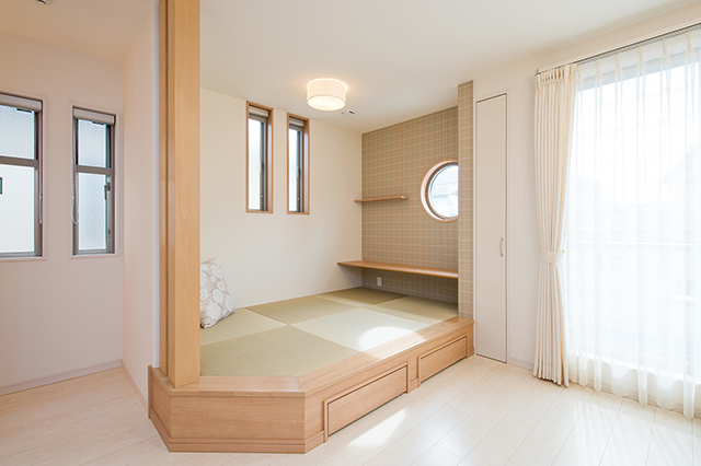 奥様 タタミコーナー自体も好評です。直に座ることができるし、ゆったりしているので姪たちが来ると喜んでここで遊んでいますね。また、壁紙についても部屋ごと、コーナーごとで変化をつけているのでお客様にも「可愛いね」というお言葉を頂いています。 -