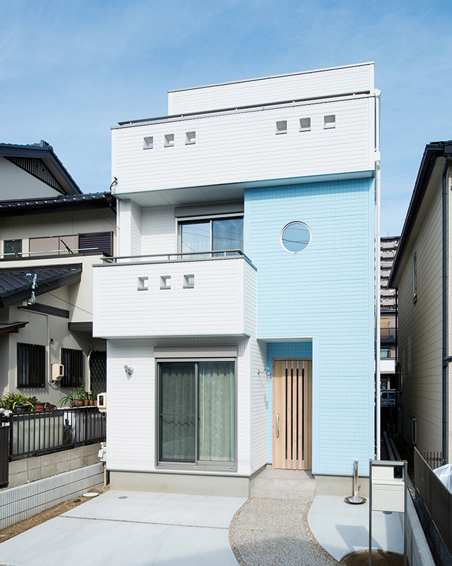 外観についてはいかがでしょうか?丸窓と外壁の淡いブルーの切り替えがとても軽やかで楽しげな雰囲気です。パワーボードの彩色はご存知無い方も多いので、参考にさせていただいています