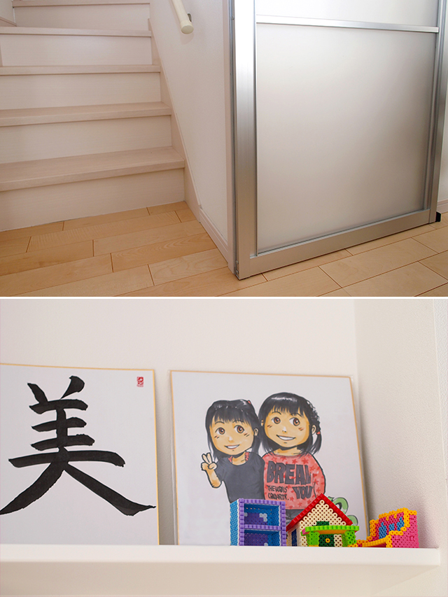 奥様 小屋裏収納も作って良かったです。雛人形などの季節品もそうですが、子供のアルバムや作品など、普段は使わないけれど取っておきたい物を保管するのにとても役立っています。 階段につけた扉もこだわりかな?家族の導線を考えると、どうしても階段はリビングインにしたかったんです。でもそのままだと冷暖房の効率が悪くなってしまうので。扉は付けて大正解でした。スケルトンにして自然光をそのまま活かせるようにしたのもポイントですね。