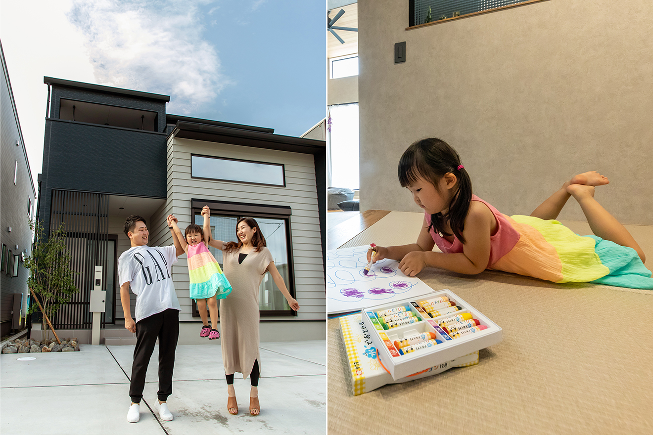 インタビューの間、こちらを覗いたりお絵描きしたりとのびのびと過ごされていたお嬢様。奥様の「このお家はどうかな?」の質問に「楽しい!」と満面の笑顔でお答えいただき、とても嬉しく思いました。これからもお嬢様をはじめ、ご家族の笑顔が絶えないように三昭堂もお力になれれば幸いです。