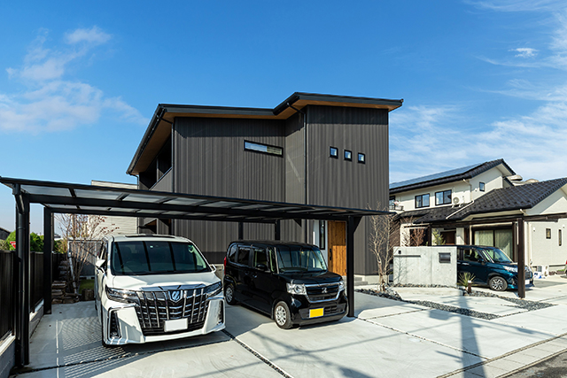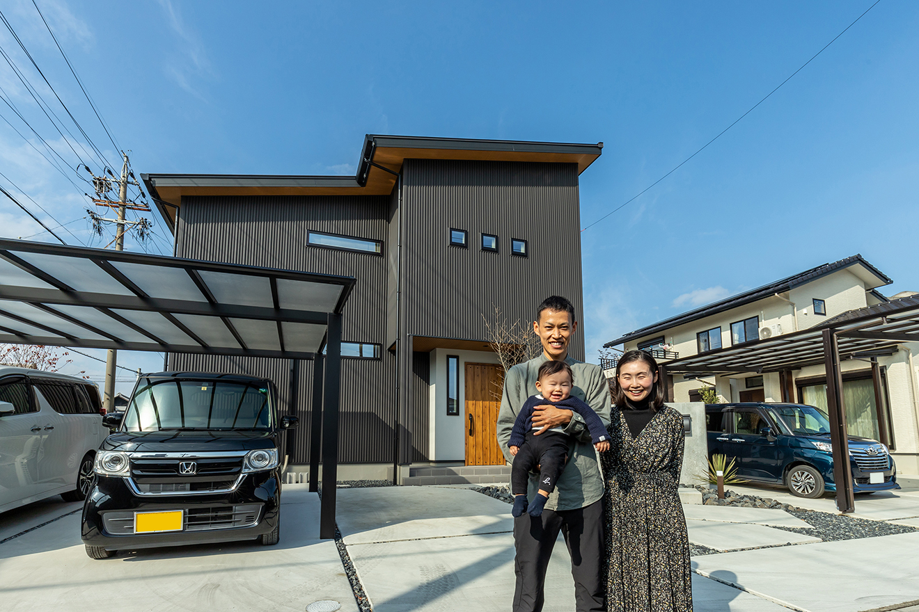 奥様 パールブラックのガルバリウムでまとめた外観を「カッコいいね」ってお褒めいただいています。この色を選んだのもICさんのアドバイスがあったからです。初めは普通の黒にしようと思っていたのですが、ICさんに「断然コッチです!」ってお薦めされて。実際に出来上がったところを見ても、こちらで正解だったなって思います。他にはキッチンや洗面室も好評ですね。洗面は「ホテルみたい」って言われています。家づくりについて相談を受けることもあるんですよ(笑)。