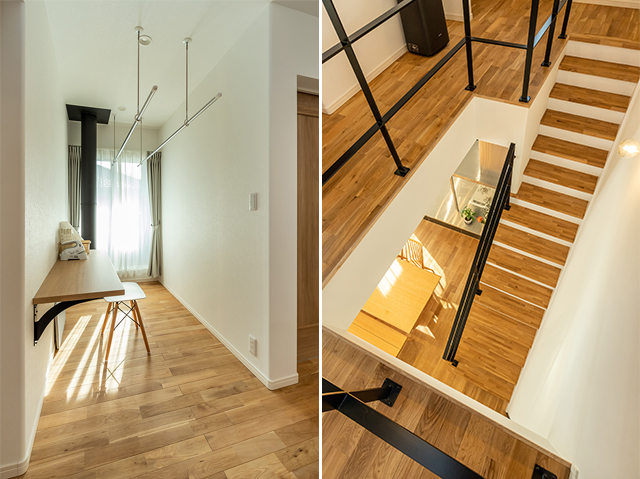 奥様 パントリーをはじめ、収納スペースがたっぷりと取ってあるのでとても便利です。また、2階ホールに作った室内物干しのスペースも大変重宝しています。私たち夫婦は二人とも花粉症で、一年の半分は室内干しにしなくてはならないので……。外干しする際はベランダを利用するのですが、この室内干しスペースから直接ベランダへ出られるのも良いですね。一部屋通り抜けてベランダへ出る場合には、洗濯物を持って上がって来て、さらにドアを開けるというひと手間が必要となりますが、それが無いだけで気持ちが軽くなりますよ。