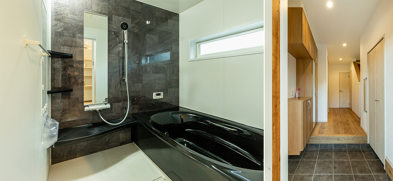 ご主人 お風呂場にはこだわりましたね。浴槽が黒色なんですが、他ではあまり無いようで驚かれたりします。後はフローリングにも気を配りました。特に親世帯の玄関には厳選したフロア材を使っています。