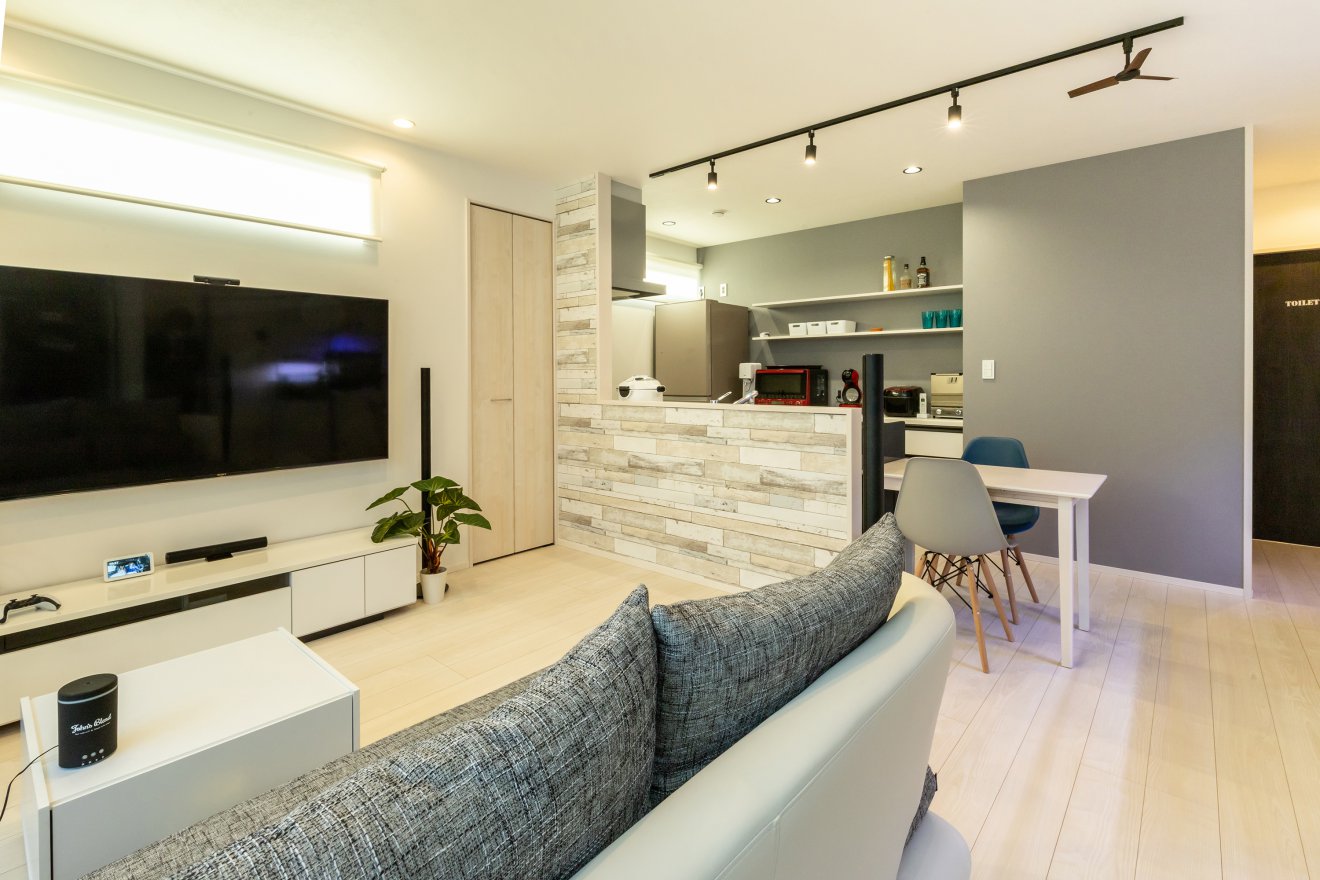 ご主人 最初はなるべく広く見えるように、もう一段階明るい色を考えていたのですが、ギリギリのところで濃いグレーに決めたんですね。その選択で本当に良かったのか、できあがるまで不安はありました。でも、この色に決めて正解でしたね。イメージ通りの仕上がりです。ライティングレールも白の予定でしたが、あえてポイントとなるように黒に変更しました。これもスタイリッシュな感じで気に入っています。
